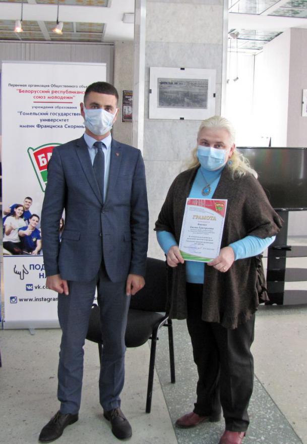 Участие в церемонии приняли первый секретарь Гомельского ГК ОО «БРСМ» Василий Левкутник, проректор по воспитательной работе ГГУ Юрий Никитюк и председатель первички вуза Мария Юркова. Важной частью мероприятия стало награждение преподавателей университета грамотами за личный вклад в развитие и реализацию проектов и программ Гомельской городской организации ОО «БРСМ».
