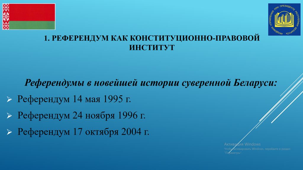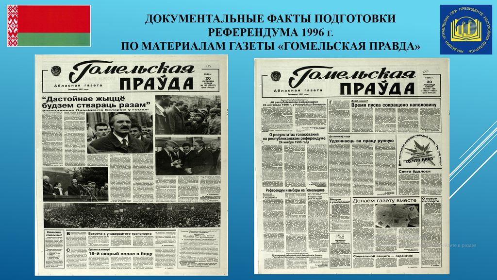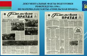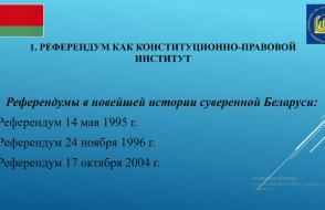 В докладе была дана характеристика референдуму как конституционно-правовому институту, представлен международный опыт проведения референдумов, рассмотрена типология референдумов, используемых в мировой практике, и обозначены виды референдумов, которые проводятся в Республике Беларусь. В выступлении рассмотрен механизм и правовые нормы организации народного голосования в нашей стране, освещены вопросы и итоги голосования в 1995 и 1996 годах, представлены документальные факты референдума 1996 г. по материалам газеты «Гомельская правда».