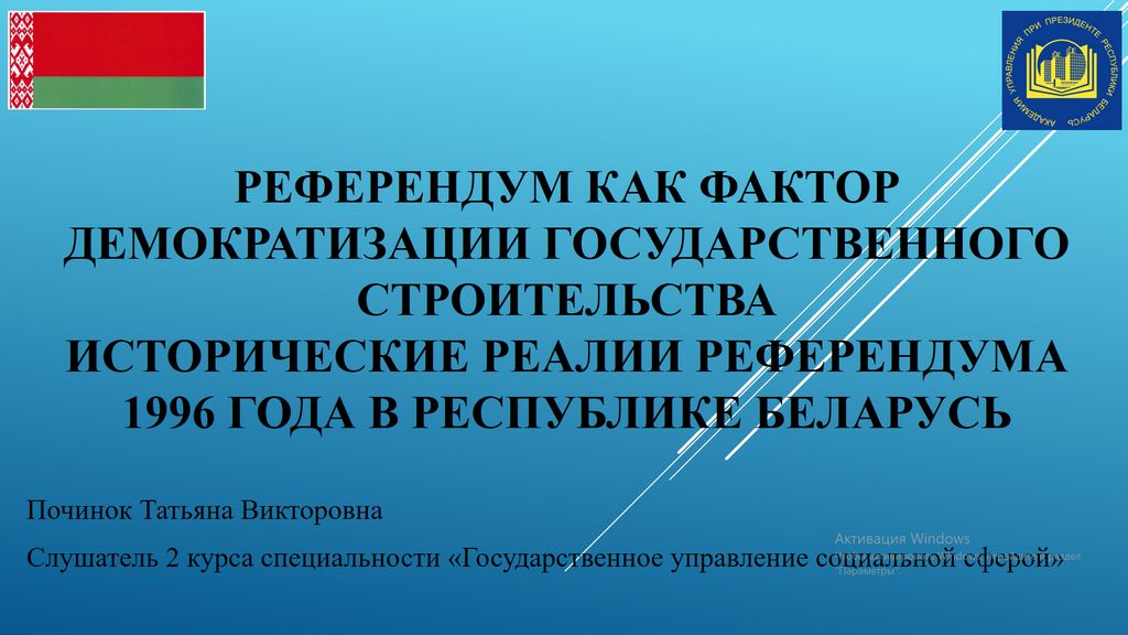Тему «Референдум как фактор демократизации государственного строительства. Исторические реалии референдума 1996 года в Республике Беларусь» представила Починок Татьяна Викторовна, слушатель 2 курса.