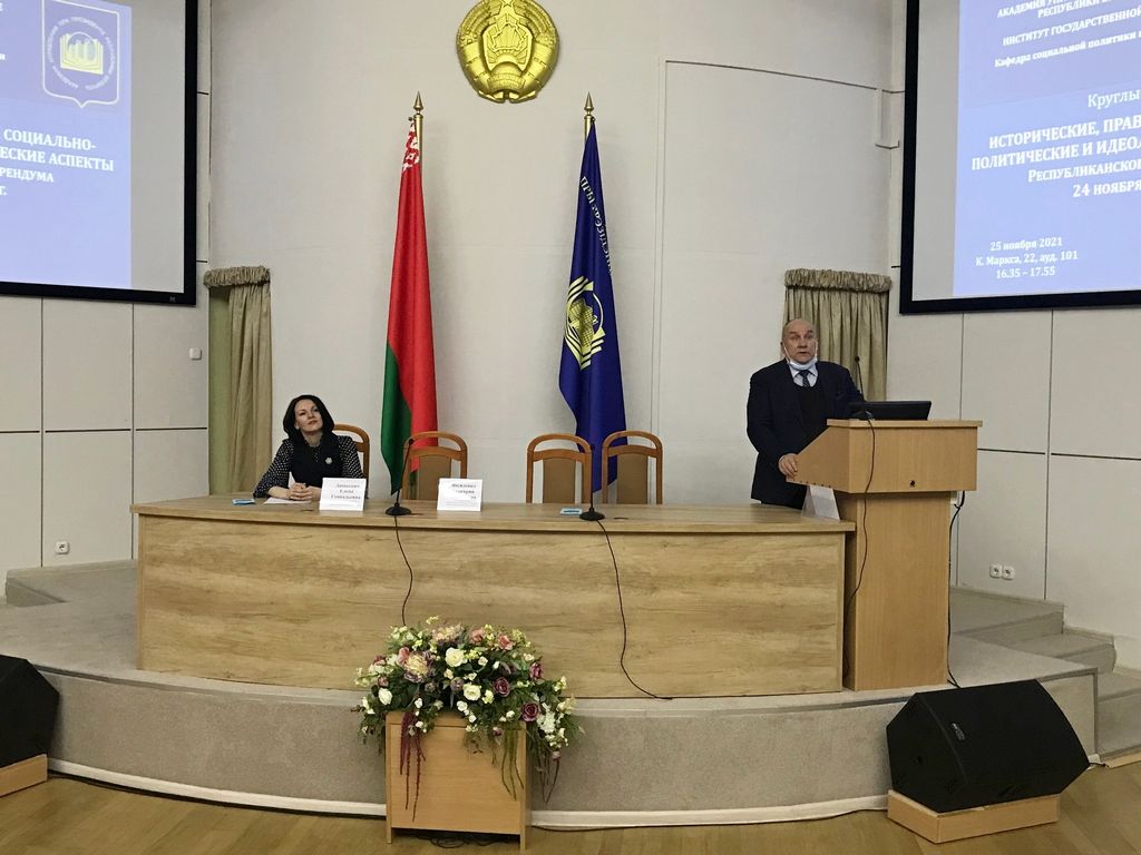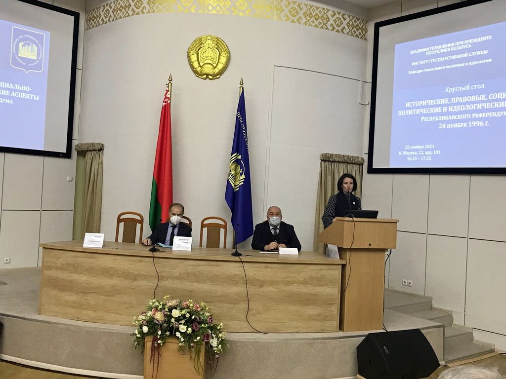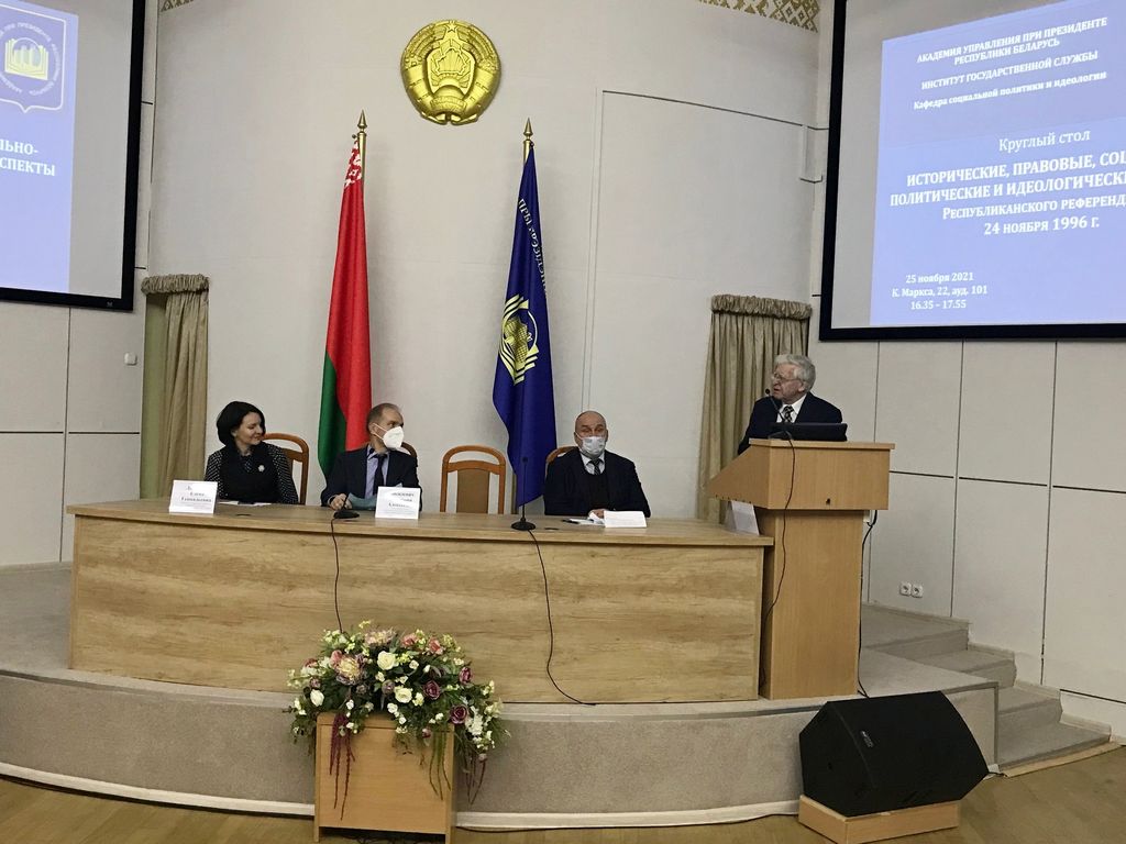 25 ноября в Институте государственной службы Академии управления при Президенте Республики Беларусь состоялся круглый стол «Исторические, правовые, социально-политические и идеологические аспекты Республиканского референдума 24 ноября 1996 г.», организованный кафедрой социальной политики и идеологии.