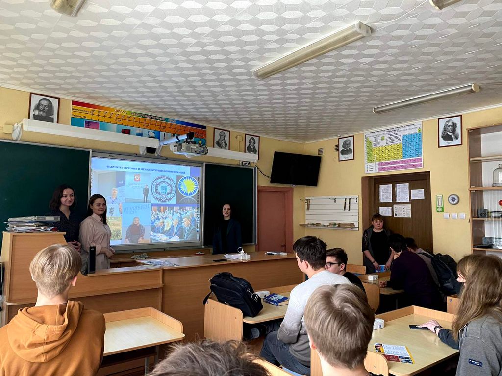 Студенты представили учащимся общую информацию об университете, специальностях факультета истории и межкультурных коммуникаций и особое внимание уделили специальности, на которой они учатся.