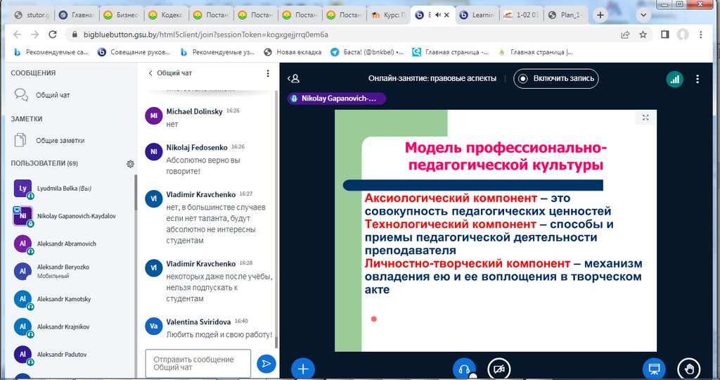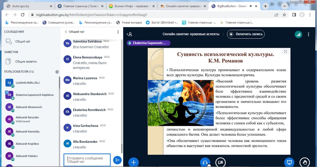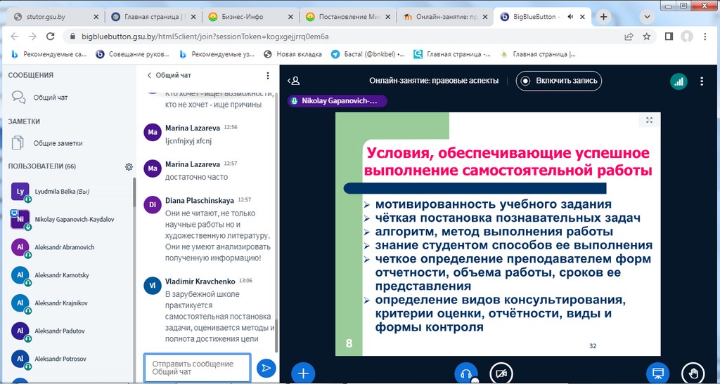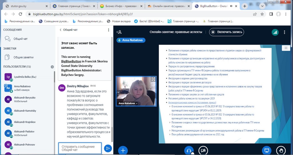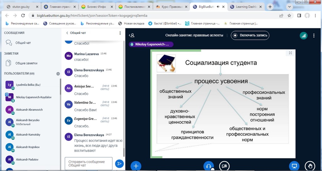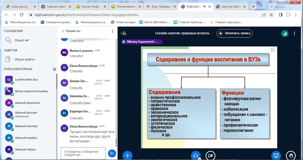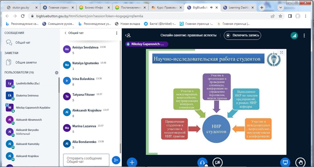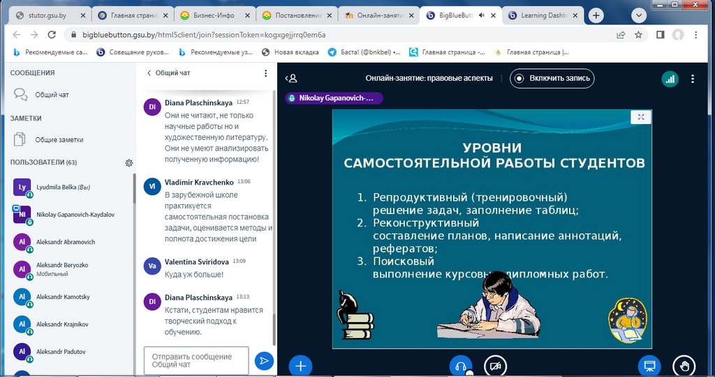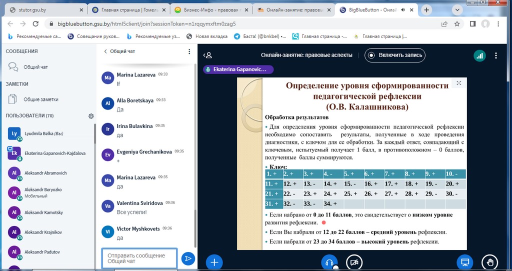 Занятия с использованием информационно-коммуникативных технологий (далее – ИКТ) были организованы на бинарной дистанционной системе ИДО «Тьютор» (ntutor.gsu.by), которая базируется на платформе Moodle с интегрированной системой видео-конференций BigBlueButton.