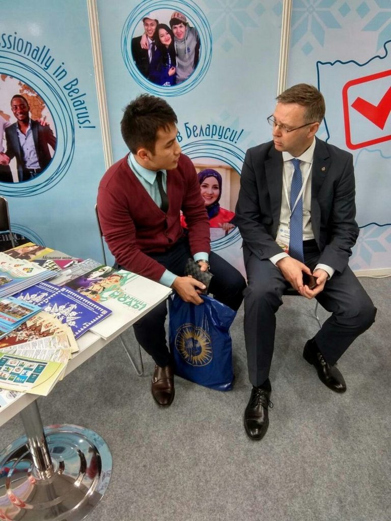 В период с 14 по 18 мая в городе Душанбе состоялась Национальная выставка Республики Беларусь в Республике Таджикистан и бизнес форум «Беларусь-Таджикистан-Афганистан». В мероприятиях принимал участие ректор университета С.А. Хахомов. В рамках выставки было запланировано участие в коллективной экспозиции Министерства образования «Образование в Беларуси», на которой был представлен спектр услуг, оказываемых в Гомельском государственном университете имени Франциска Скорины. Во время работы  экспозиции состоялась встреча ректора с директором государственного учреждения «Центр международных программ» Исматулло Шодиевым, посещавшим наш университет в феврале 2018 года для обсуждения вопросов развития сотрудничества в области образования (приглашения таджикских студентов на учебу в наш вуз) и иных сферах (научно-исследовательская деятельность, участие в программах академической мобильности, совместная подготовка специалистов). Интересной оказалась встреча с Махмудовым Джемшитом, успешно завершившим в 2015 году обучение в магистратуре по специальности «Мировая экономика» в рамках межправительственного соглашения между Республикой Беларусь и Республикой Таджикистан.  Джемшит выразил благодарность университету за полученные знания, которые позволили ему успешно трудоустроиться на родине в банковской сфере.