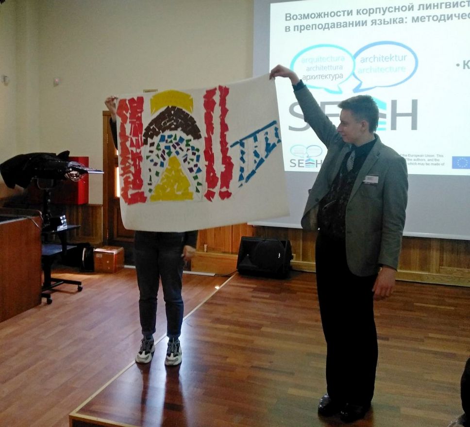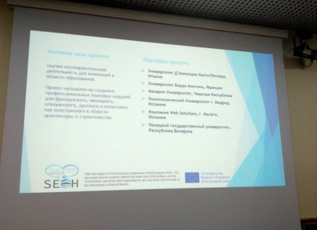 После интерактивной экскурсии по корпусам бывшего Полоцкого иезуитского коллегиума заведующий кафедрой славянской филологии Полоцкого  университета С.М. Лясович познакомила участников семинара с созданием лингвистического корпуса «SEAH» и основами работы с ним, а доцент кафедры славянской филологии Н.В. Нестер рассказала об опыте создании учебных модулей по специальности «Архитектура и строительство».