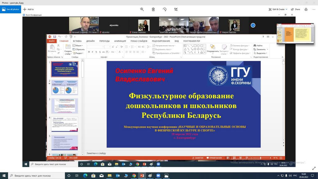 27–28 апреля кафедра теории и методики физической культуры Гомельского государственного университета имени Ф. Скорины приняла участие в XI Международной научно-практической конференции «Медико-биологические и педагогические основы адаптации, спортивной деятельности и здорового образа жизни» (г. Воронеж, Россия) и Международной научной конференции «Научные и образовательные основы в физической культуре и спорте» (г. Екатеринбург, Россия).