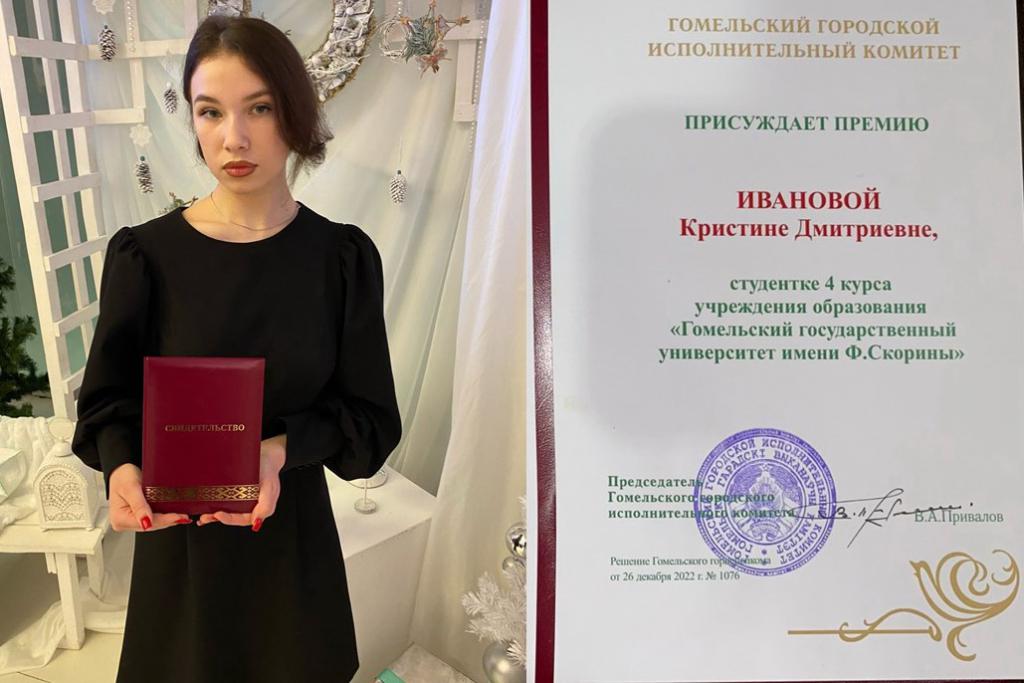 В числе награжденных — студентка 4 курса факультета психологии и педагогики ГГУ имени Ф. Скорины Кристина Иванова. Благодаря упорству и трудолюбию за годы учебы в зачетку девушки попадали только девятки и десятки. А еще она успевает участвовать в жизни факультета и вуза, осваивать дополнительные образовательные программы.