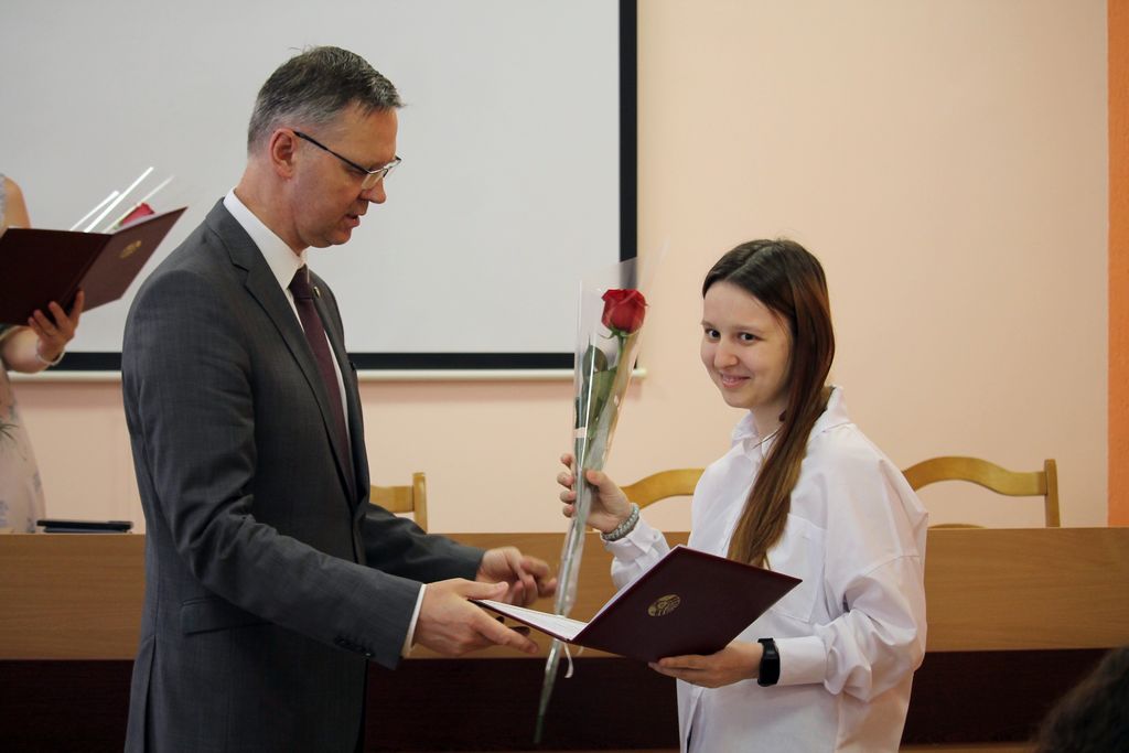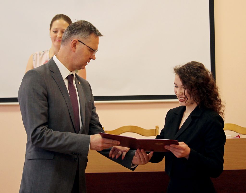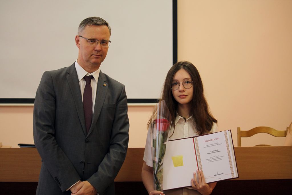 Три студентки ГГУ получили Свидетельства специального фонда Президента Республики Беларусь по социальной поддержке одаренных учащихся и студентов из рук ректора университета Сергея Хахомова.
