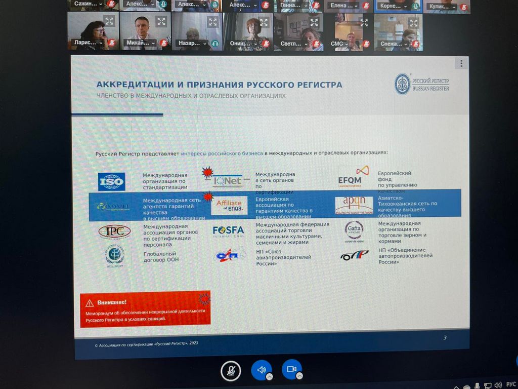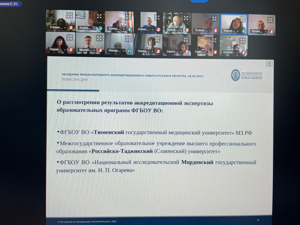 Декан факультета иностранных языков Елена Сажина приняла участие в очередном заседании Аккредитационного Совета Ассоциации по сертификации «Русский Регистр». Рассмотрены результаты аккредитационной экспертизы образовательных программ ФГБОУ ВО «Национальный исследовательский Мордовский государственный университет имени Н.П. Огарева», Межгосударственного ОУВО «Российско-Таджикский (Cлавянский) университет», ФГБОУ ВО «Тюменский государственный медицинский университет» Министерства здравоохранения РФ. Был заслушан доклад о тенденциях интегрирования НОК (независимой оценки квалификации) в аккредитационные процедуры (спикер: Волков А.Г. – директор Института развития квалификаций СПб ГЭТУ «ЛЭТИ»).
