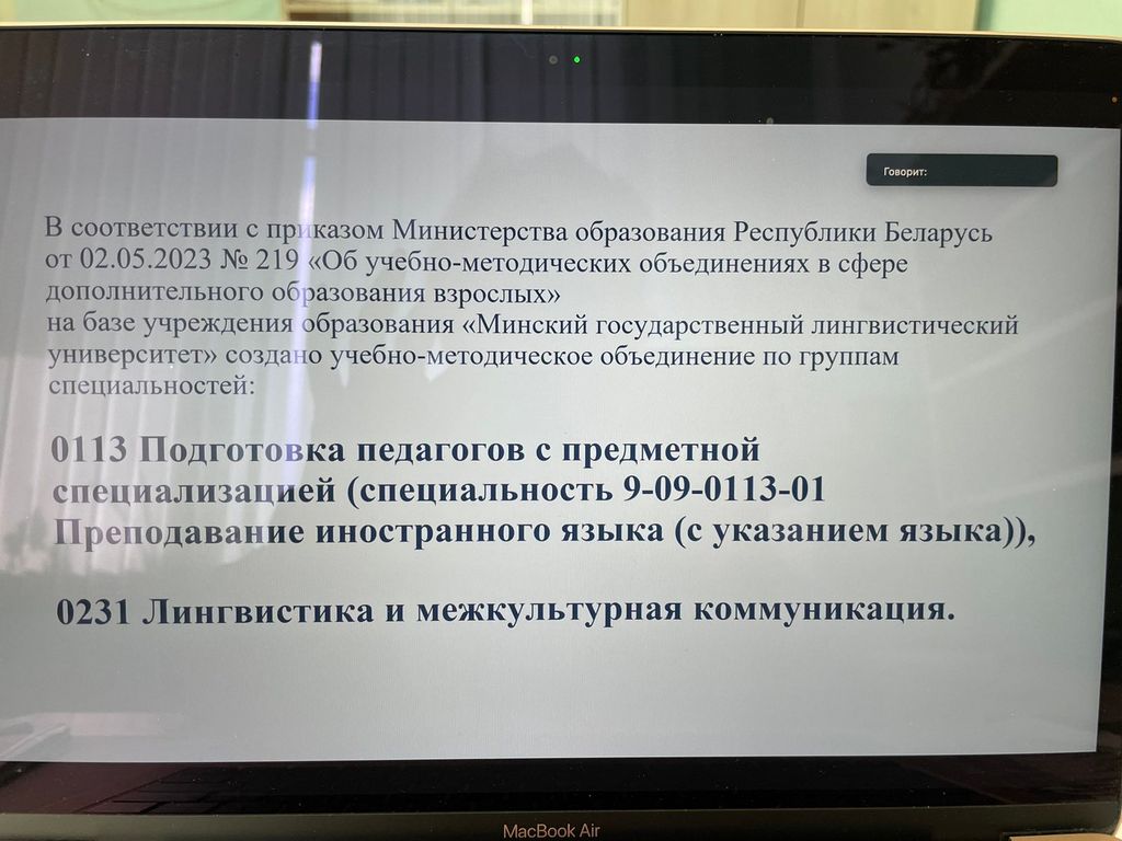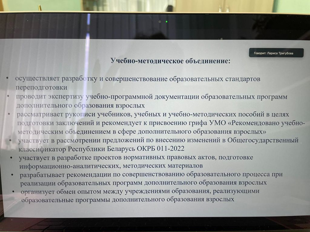 Также Елена Владимировна приняла участие в работе учебно-методического объединения в сфере дополнительного образования взрослых по специальностям переподготовки «Преподавание иностранного языка и Переводческая деятельность», инициированного ИПК Минского государственного лингвистического университета, на заседании которого были обсуждены предложения и приняты согласованные решения для представления проектов документов в РИВШ. Заседание прошло продуктивно, все поставленные цели были достигнуты.