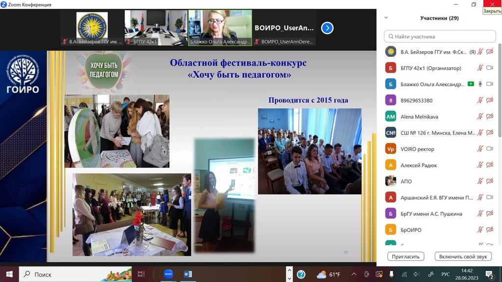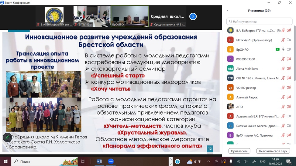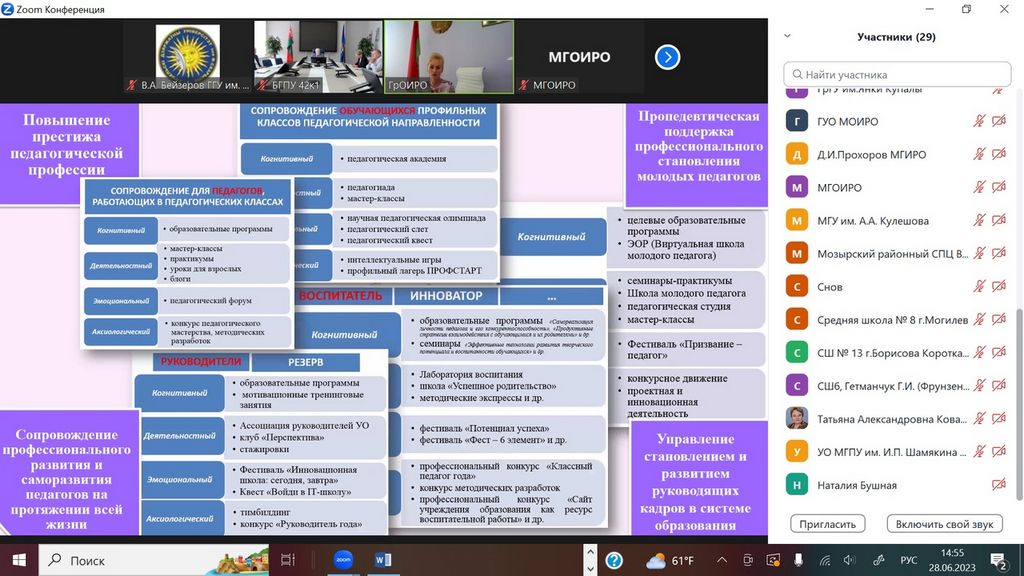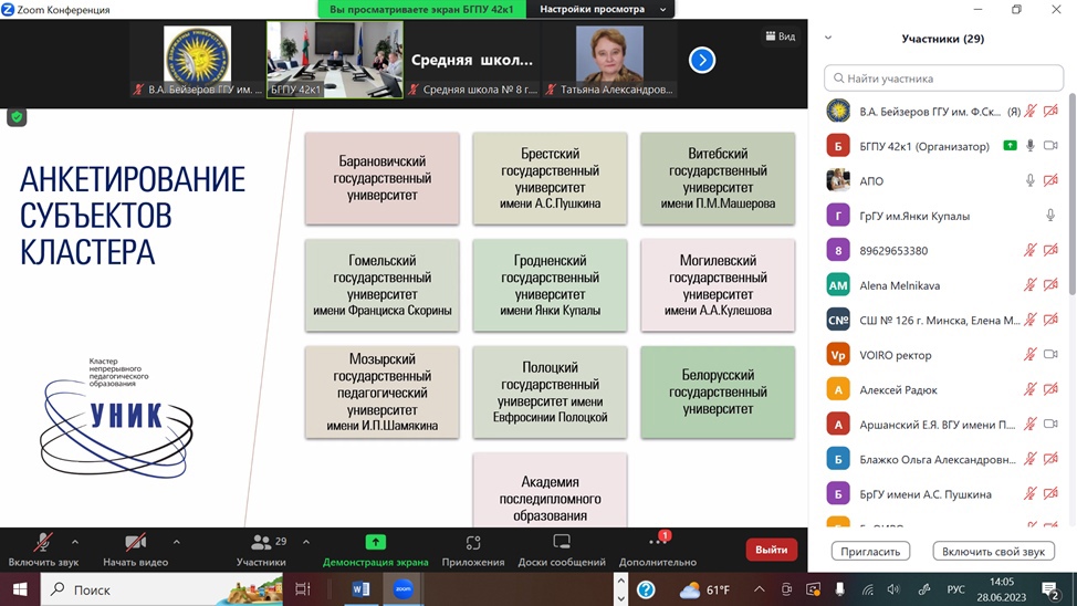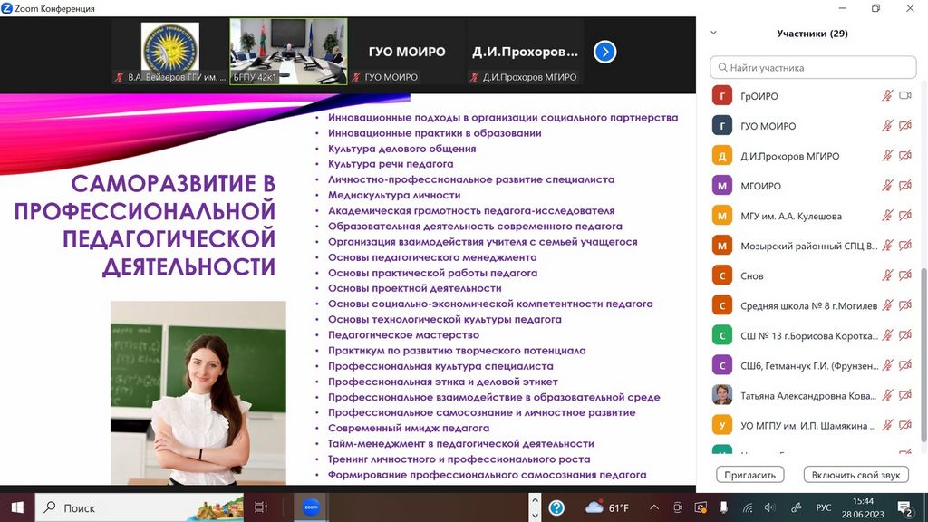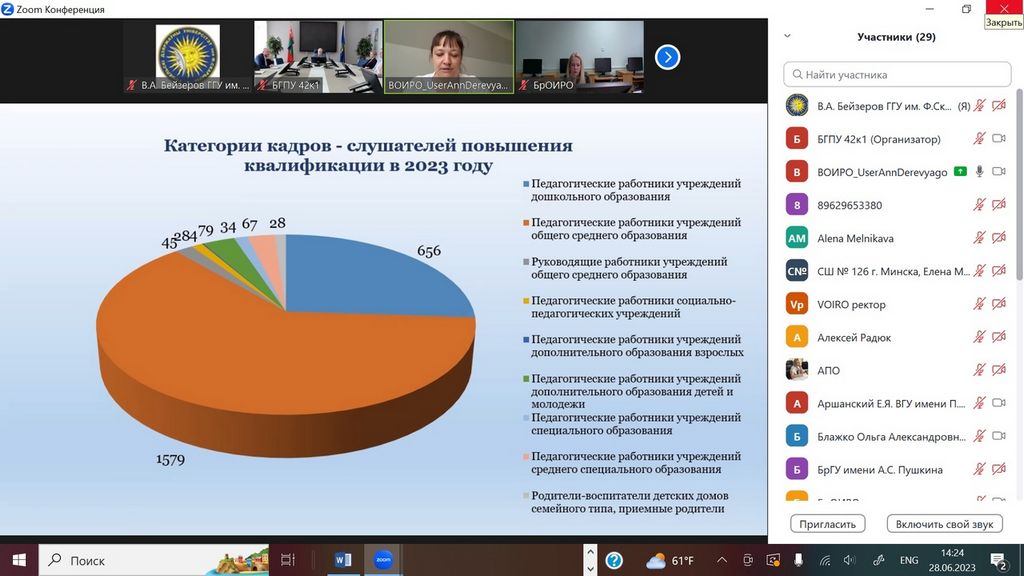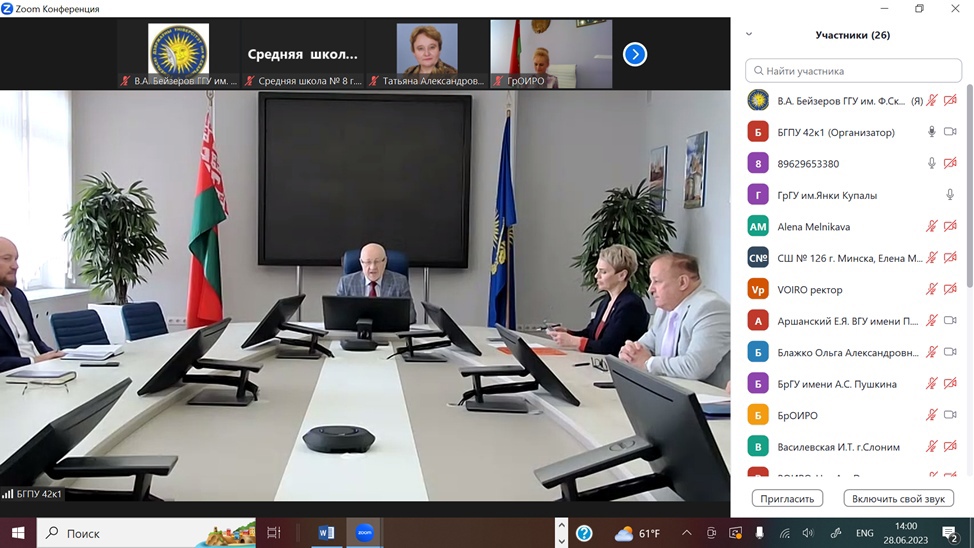 28 июня в онлайн-формате прошло совместное заседание Координационного совета по вопросам непрерывного педагогического образования и совета учебно-методического объединения по педагогическому образованию. Участие в мероприятии принял декан факультета психологии и педагогики Владислав Бейзеров. В ходе заседания обсуждались проблемы и перспективы развития дополнительного образования взрослых и развития системы непрерывного педагогического образования. Организатором мероприятия выступило учреждение образования «Белорусский государственный педагогический университет имени М. Танка».