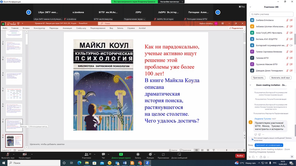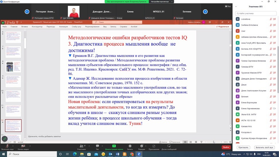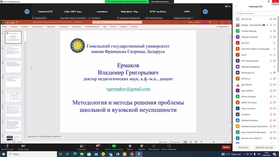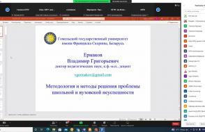 В рамках данного проекта 14 сентября в режиме онлайн состоялась лекция В.Г.Ермакова, доктора педагогических наук, доцента кафедры социальной и педагогической психологии факультета психологии и педагогики Гомельского государственного университета имени Ф. Скорины на тему: «Методология и методы решения проблемы школьной и вузовской неуспешности».