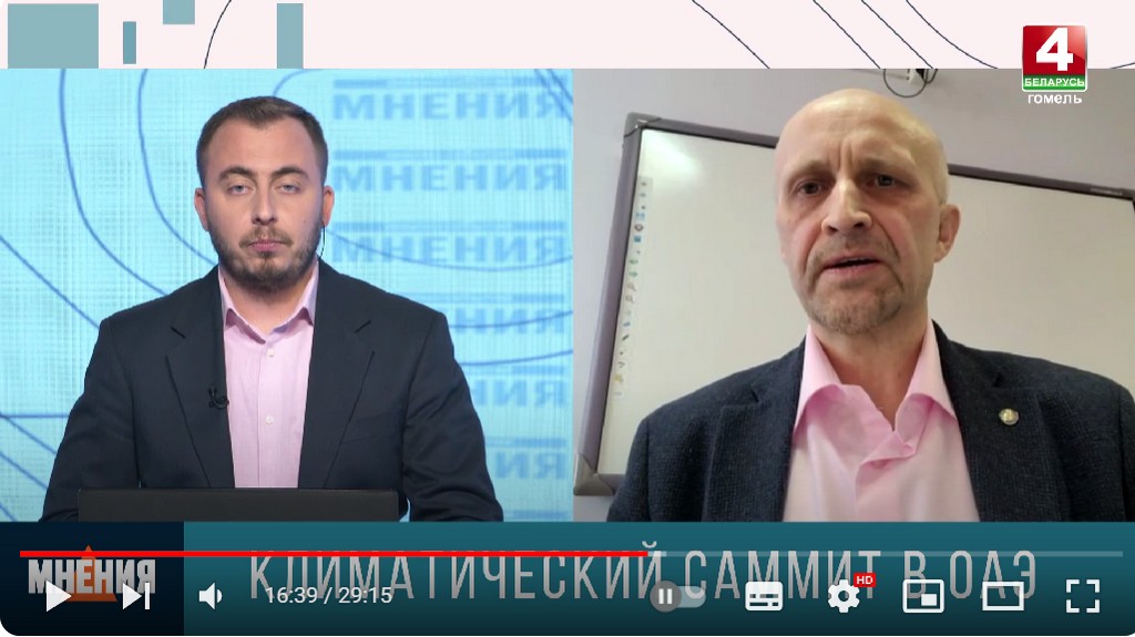 Заведующий кафедрой геологии и географии Андрей Гусев принял участие в программе «Мнения» (5 декабря 2023 года), посвященной 28-й конференции сторон Рамочной конвенции ООН об изменении климата в Дубае (COP28). Снова климатическая тема. Тезисно. Беларусь больше поглощает, чем выделяет углекислого газа. Атомная генерация – наше безуглеродное будущее. Мировая борьба с климатом идет, а потребление углеводородов растет. А кто больше всего жжёт угля. Все равны, но некоторые равнее. 10% самых богатых выделяют 45% углекислого газа. Мейнстрим климатологии: глобальное потепление и антропогенные выбросы. Геологическое время – это очень медленно с точки зрения человеческой жизни.
