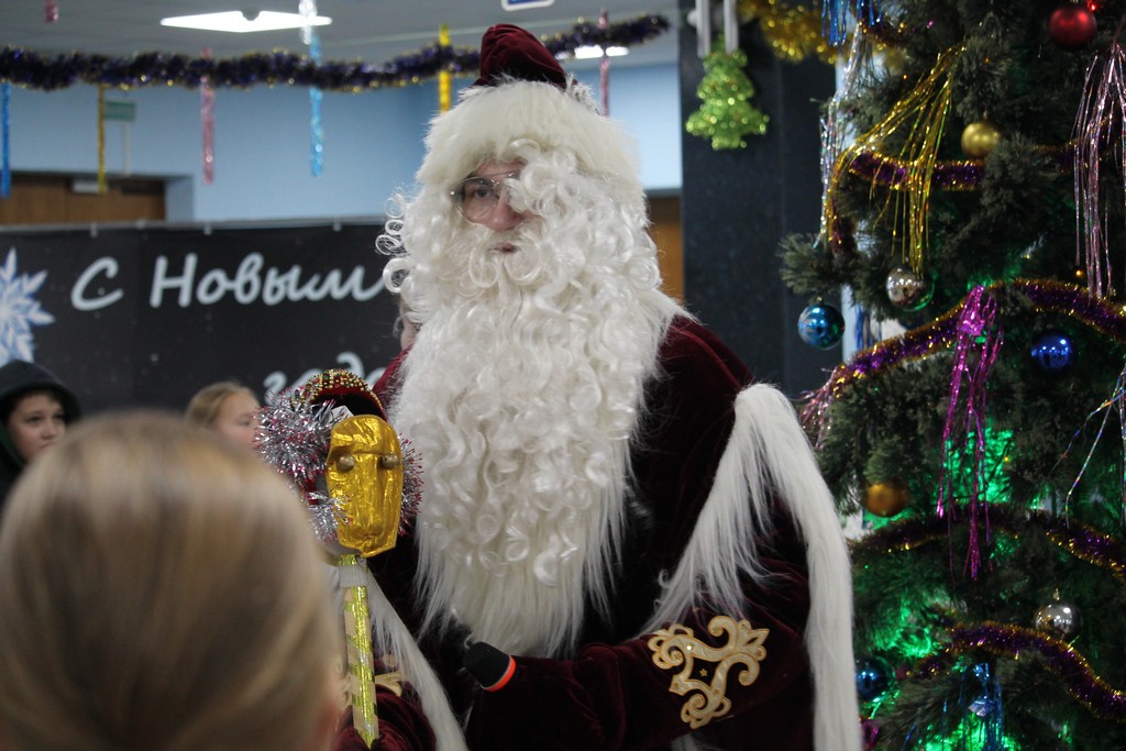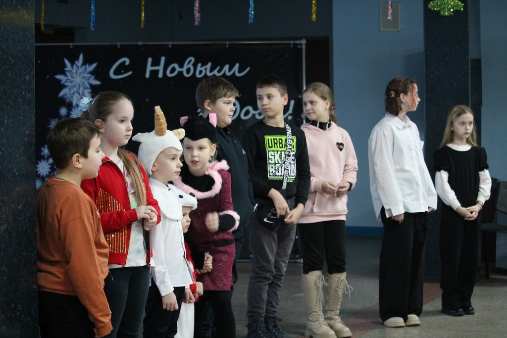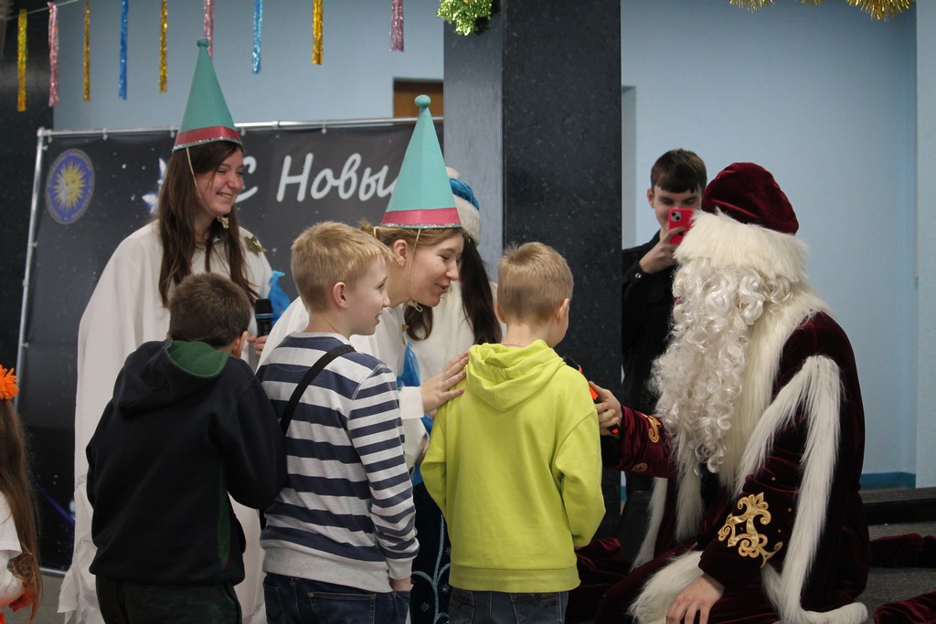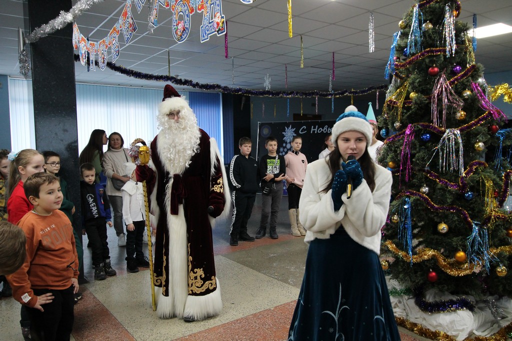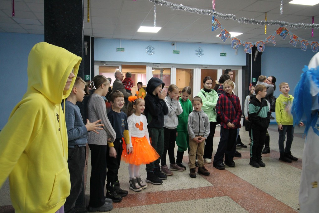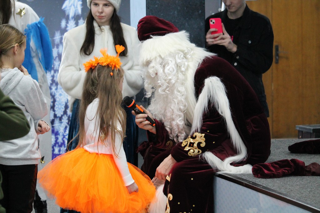 До спектакля в фойе перед актовым залом для детей была организована интерактивная программа с Дедом Морозом, Снегурочкой, сказочными персонажами, веселыми конкурсами. Каждый ребенок мог рассказать стишок Деду Морозу и получить сладкий приз.