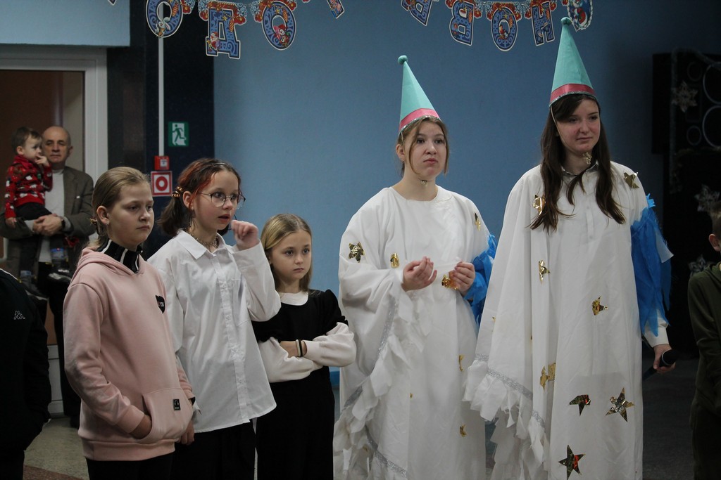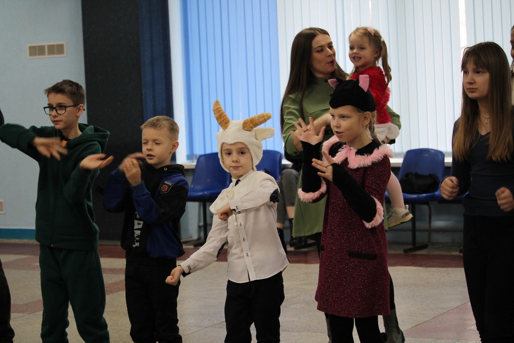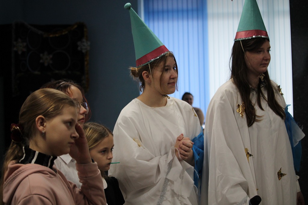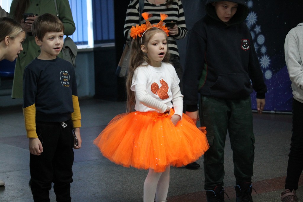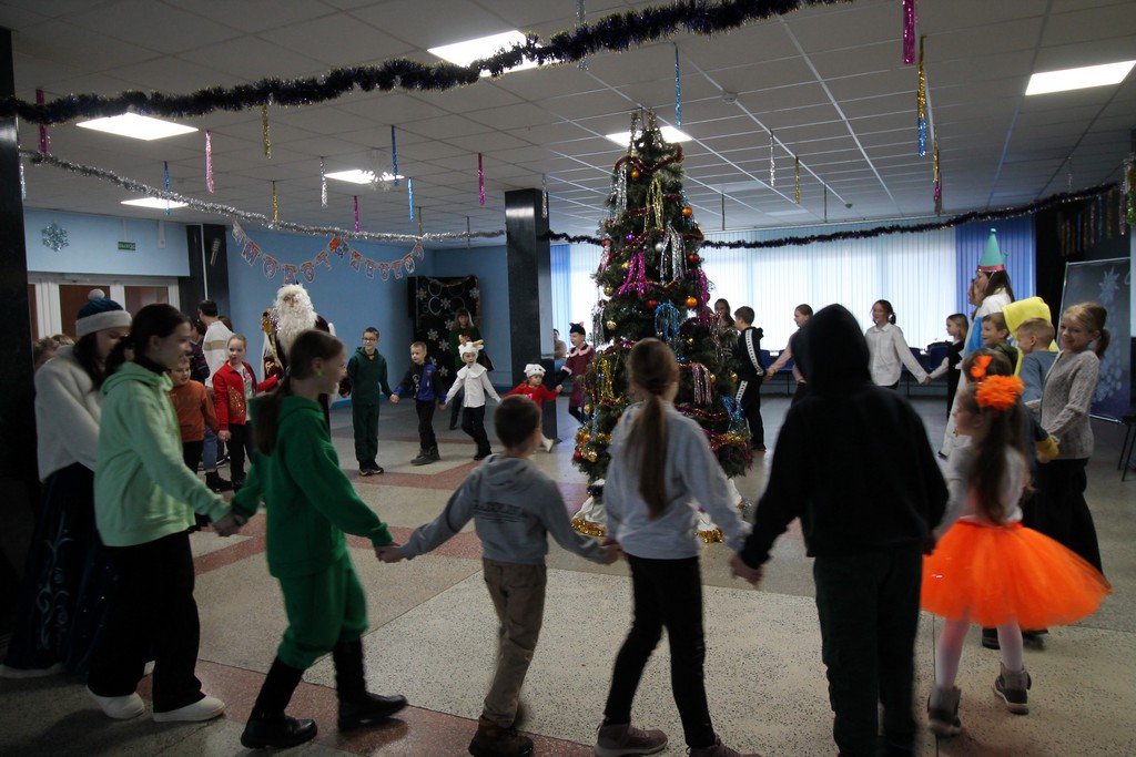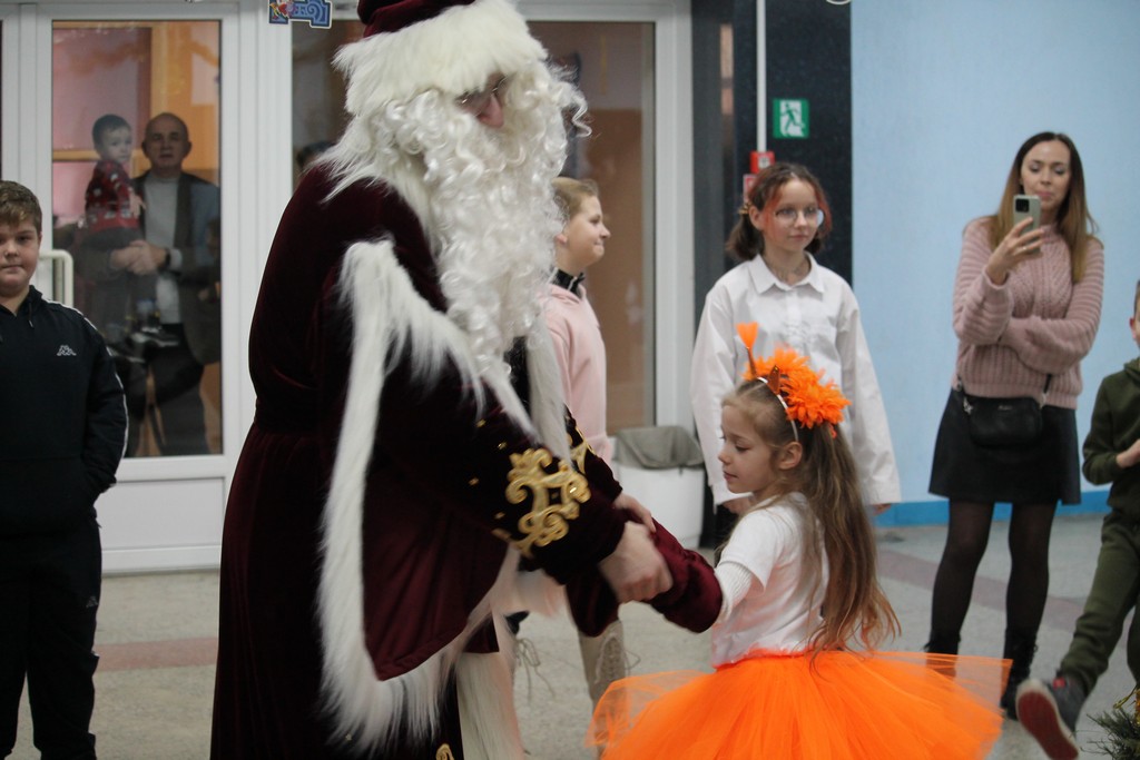 До спектакля в фойе перед актовым залом для детей была организована интерактивная программа с Дедом Морозом, Снегурочкой, сказочными персонажами, веселыми конкурсами. Каждый ребенок мог рассказать стишок Деду Морозу и получить сладкий приз.
