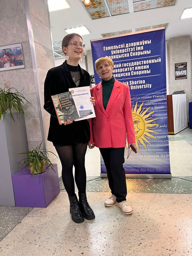 Об этих планах студентки-отличницы, являющейся обладателем диплома первой степени по итогам участия в республиканской конкурсе « Грани творчества» и ее творческом отношении к любому делу с теплотой рассказала куратор группы Ф-43п Анна Николаевна Годлевская. Символическим оказался её подарок Эвелине, врученный во всемирный день дарения книг – «Золотые правила народной культуры» теперь в библиотеке студентки.