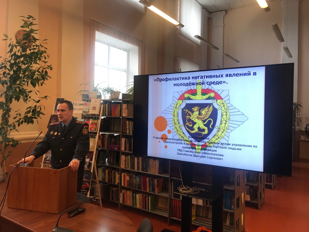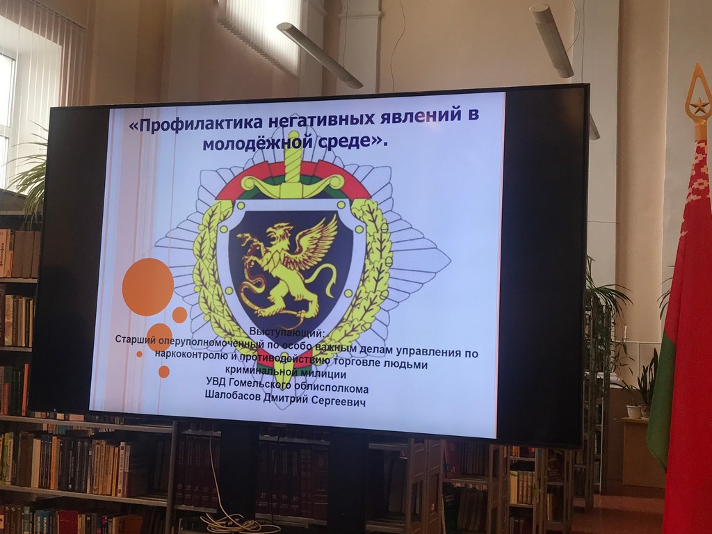 13 марта 2024 года состоялась воспитательная беседа представителей правоохранительных органов со студенческой молодежью, приуроченная к Международному дню борьбы с наркоманией и незаконным оборотом наркотиков. Экспертами выступили сотрудники управления внутренних дел Гомельского областного исполнительного комитета – Новиков Денис Сергеевич, старший инспектор отдела идеологии, подполковник, и Шалобасов Дмитрий Сергеевич, старший уполномоченный по особо важным делам отделения по противодействию торговле людьми управления по наркоконтролю и противодействию торговле людьми криминальной милиции, подполковник.