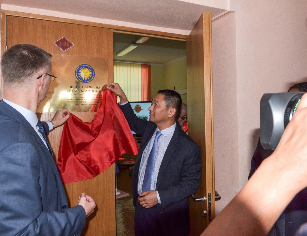 Красную ленту во время торжественной церемонии перерезали ректор ГГУ Сергей Хахомов и проректор Шанхайского института индустрии, коммерции и иностранных языков Дуань Жэньци.