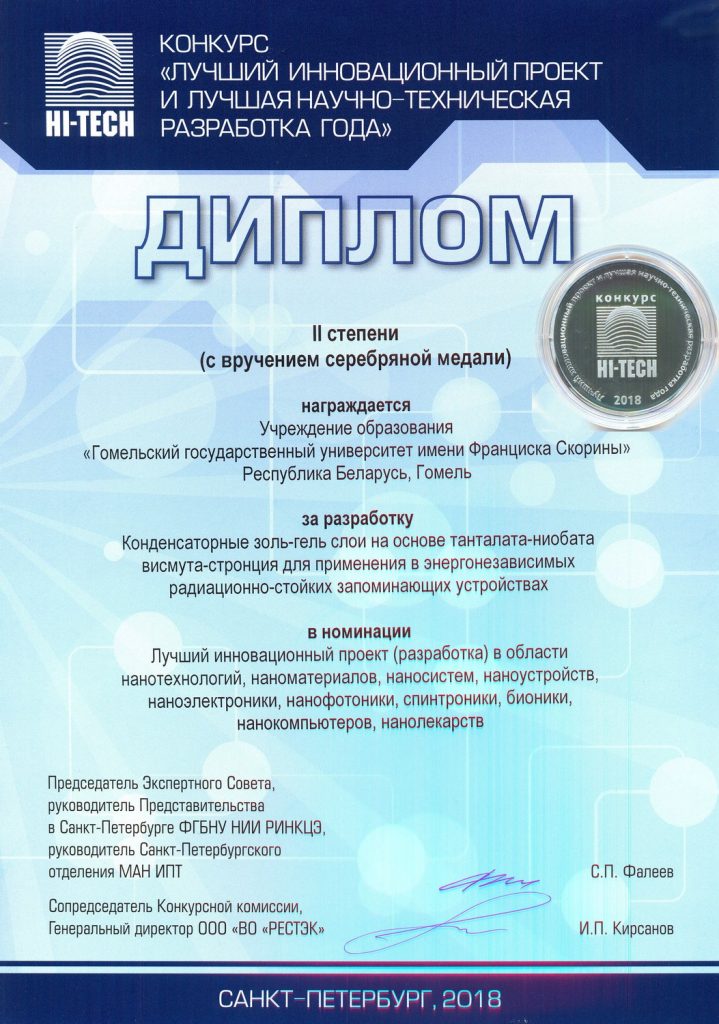 Совместный проект «Конденсаторные золь-гель слои на основе танталата-ниобата висмута-стронция для применения в энергонезависимых радиационно стойких запоминающих устройствах» ОАО «Интеграл» - управляющая компания холдинга «Интеграл» и Проблемной научно-исследовательской лаборатории Гомельского государственного университета имени Ф. Скорины стал обладателем серебряной медали на конкурсе «Лучший инновационный проект и лучшая научно-техническая разработка года», который проходил рамках Петербургской технической ярмарки и выставки HI-TECH в Санкт-Петербурге.