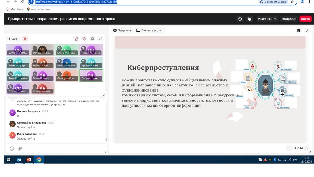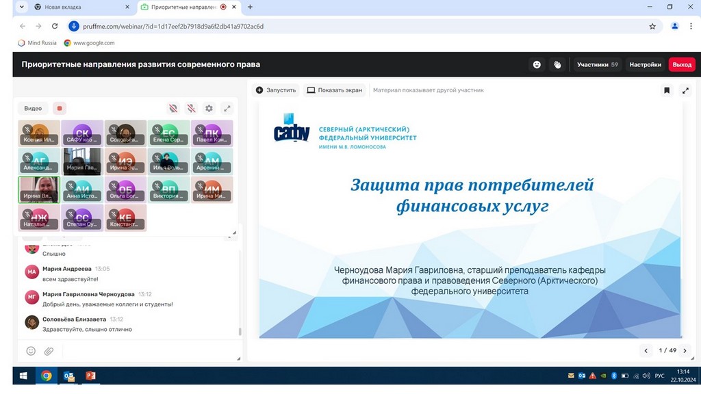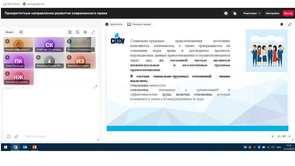 С 21 по 24 октября 2024 года студенты юридического факультета приняли участие в очередной V Международной онлайн-школе «Приоритетные направления развития современного права», организованной совместно юридическим факультетом университета и высшей школой экономики, управления и права Северного (Арктического) федерального университета имени М.В.Ломоносова.