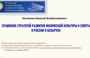 От факультета физической культуры с научными докладами выступили профессор кафедры спортивных дисциплин Гомельского государственного университета имени Франциска Скорины, д.п.н., профессор Евгений Врублевский («Использование мультидисциплинарного подхода в спортивной тренировке легкоатлетов») и заведующий кафедрой теории и методики физической культуры, к.п.н., доцент Евгений Осипенко («Сравнение стратегий развития физической культуры и спорта в России и Беларуси»).