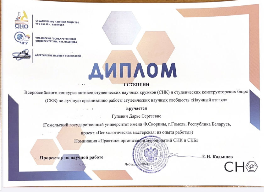 Первое место в номинации «Практики организации мероприятий студенческих научных кружков и студенческих конструкторских бюро» завоевала студентка факультета психологии и педагогики ГГУ им. Ф. Скорины Дарья Гулевич. Этот успех подчёркивает высокий уровень студенческих научных инициатив в университете и вдохновляет других студентов на активное участие в научной жизни.