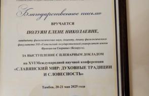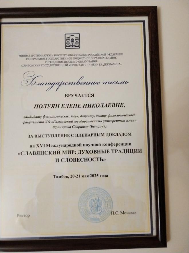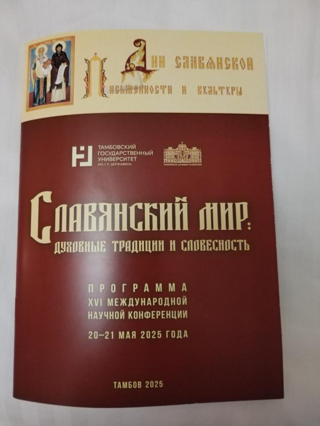 З 20 па 21 мая ў Тамбоўскім дзяржаўным універсітэце імя Г. Р. Дзяржавіна праходзіла XVI Міжнародная навуковая канферэнцыя “Славянскі свет: духоўныя традыцыі і сучаснасць”, прысвечаная Дню славянскай пісьменнасці і культуры.