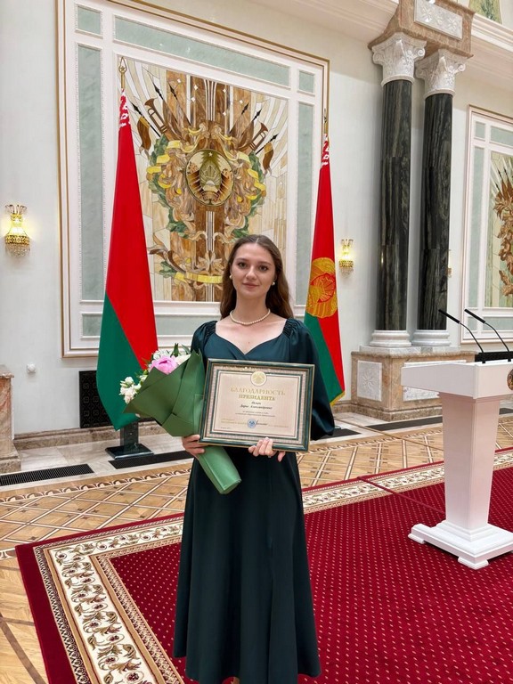 В числе участников торжественного мероприятия – студентка 4-го курса экономического факультета Гомельского государственного университета имени Ф. Скорины Дарья Оснач. Дарье объявлена Благодарность Президента за отличные успехи в учебе и активную общественную деятельность.