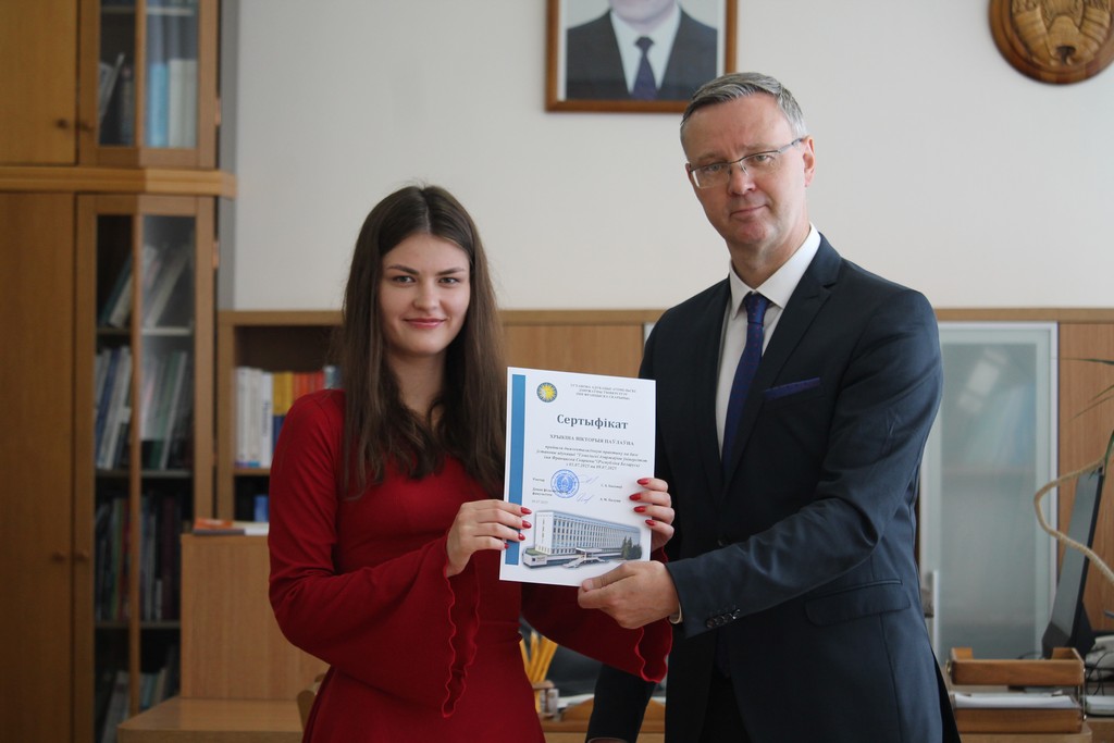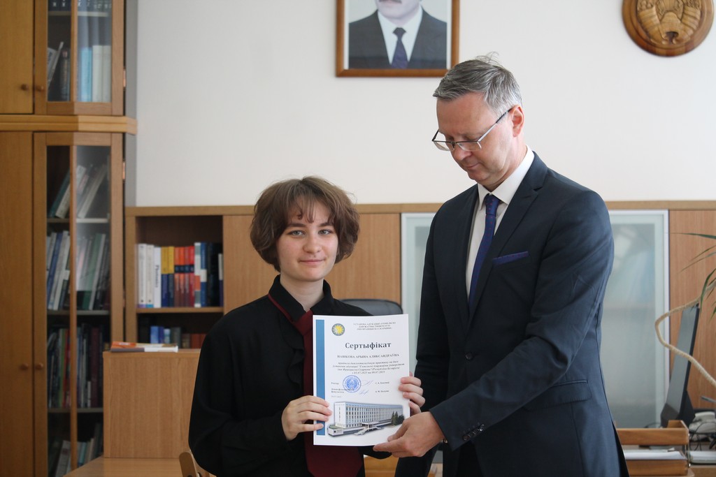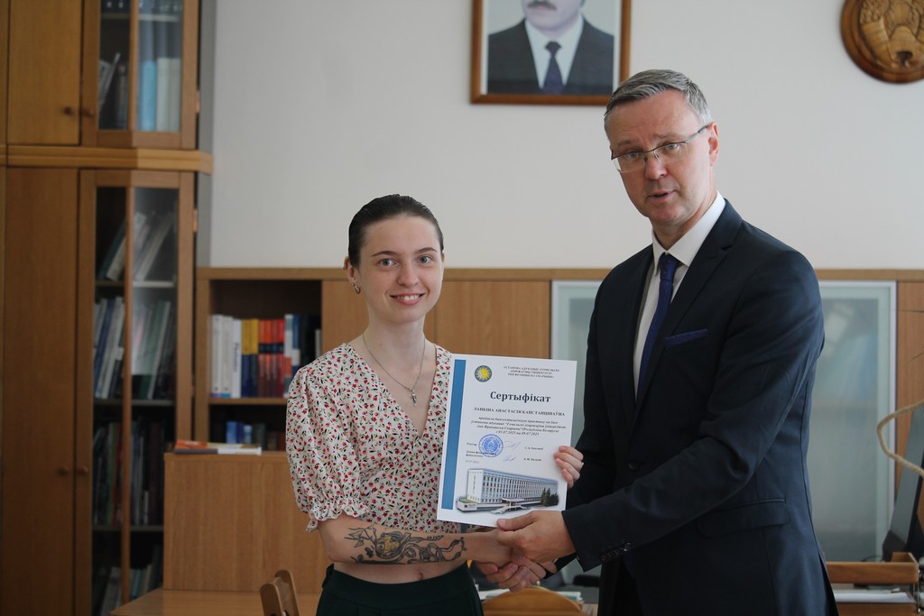 Рэктар урычыў студэнтам і выкладчыку сертыфікаты аб праходжанні вучэбнай практыкі на базе ГДУ імя Францыска Скарыны.