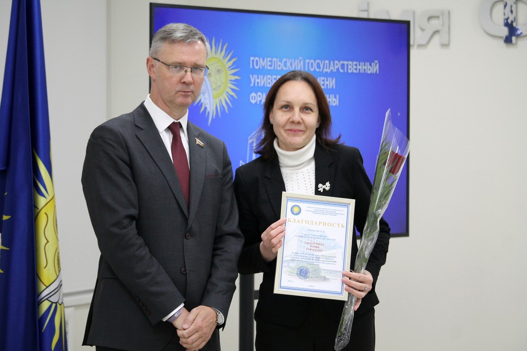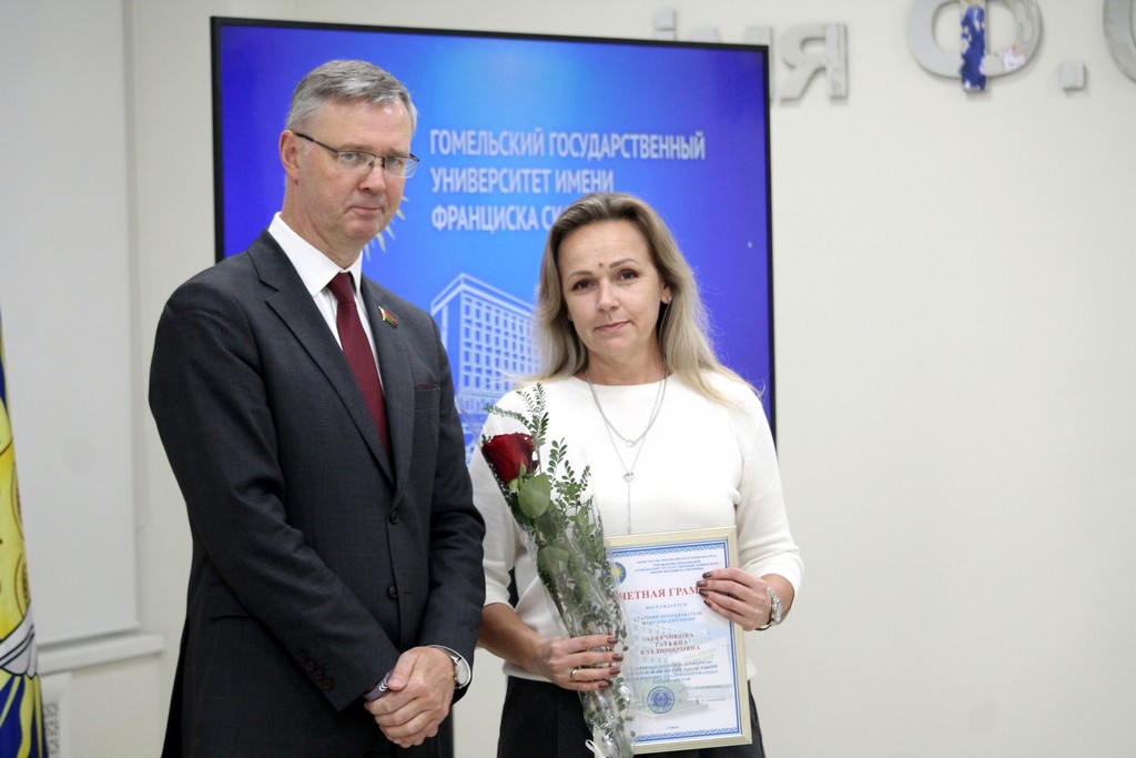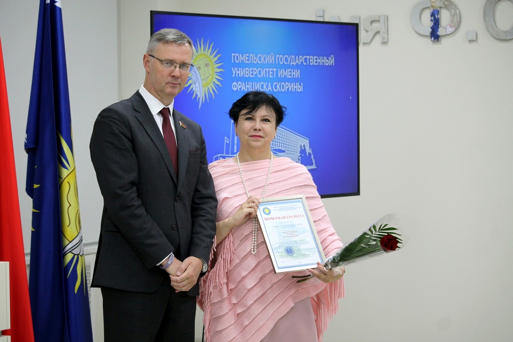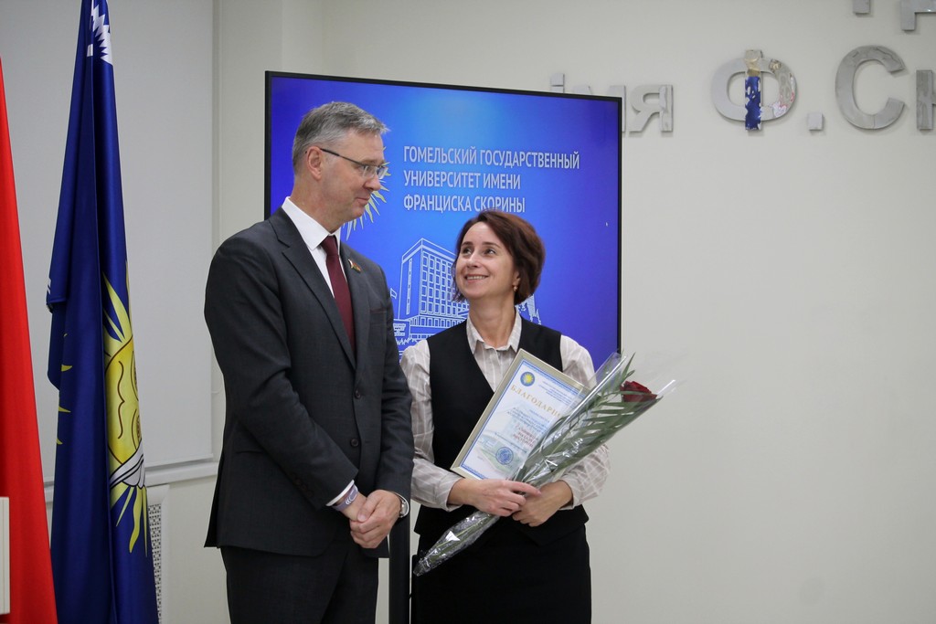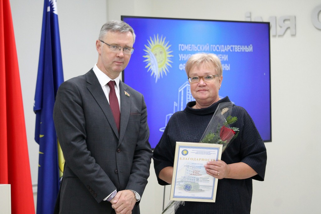 Благодарности Премьер-министра Республики Беларусь «за шматгадовую пленную навукова-педагагiчную дзейнасць, дасягнутыя поспехi ў падрыхтоўцы высокаквалiфiкаваных спецыялiстаў» удостоен профессор кафедры алгебры и геометрии Виктор Монахов. В связи с присвоением ученого звания доцента по специальности «Электроника и наноэлектроника» аттестат доцента вручен доценту кафедры общей физики Сергею Соколову. Почетной грамотой университета за многолетнюю плодотворную учебную и воспитательную работу по подготовке квалифицированных специалистов награждены старший преподаватель кафедры биологии Татьяна Азявчикова, кандидат химических наук, доцент кафедры химии Елена Воробьева, кандидат физико-математических наук, доцент, заведующий кафедрой оптики Владимир Гайшун, кандидат экономических наук, доцент кафедры экономической информатики, учета и коммерции Сергей Говейко, кандидат филологических наук, доцент кафедры белорусского языка Екатерина Хазанова.