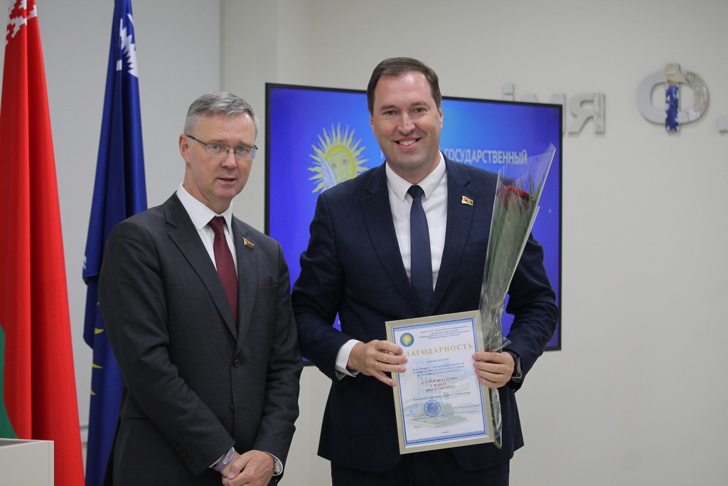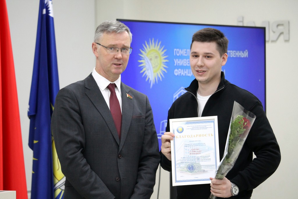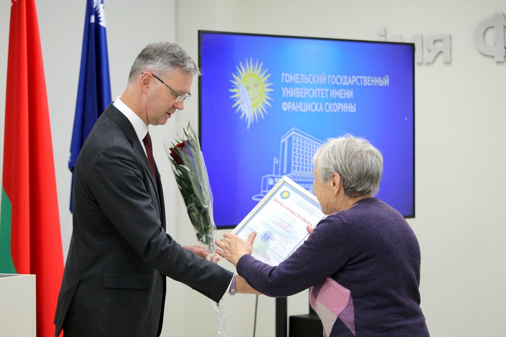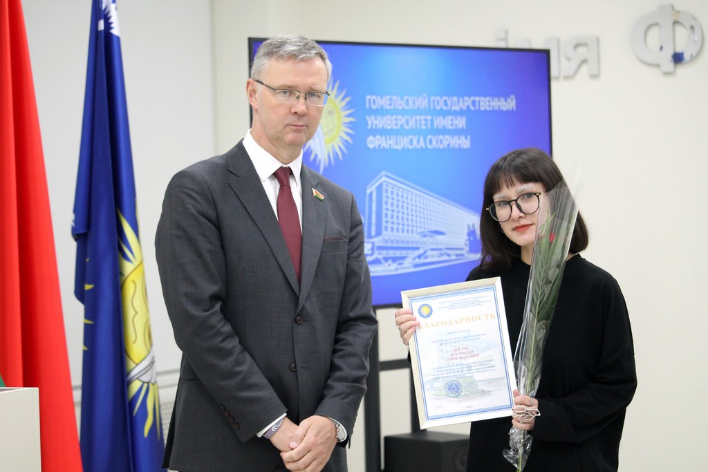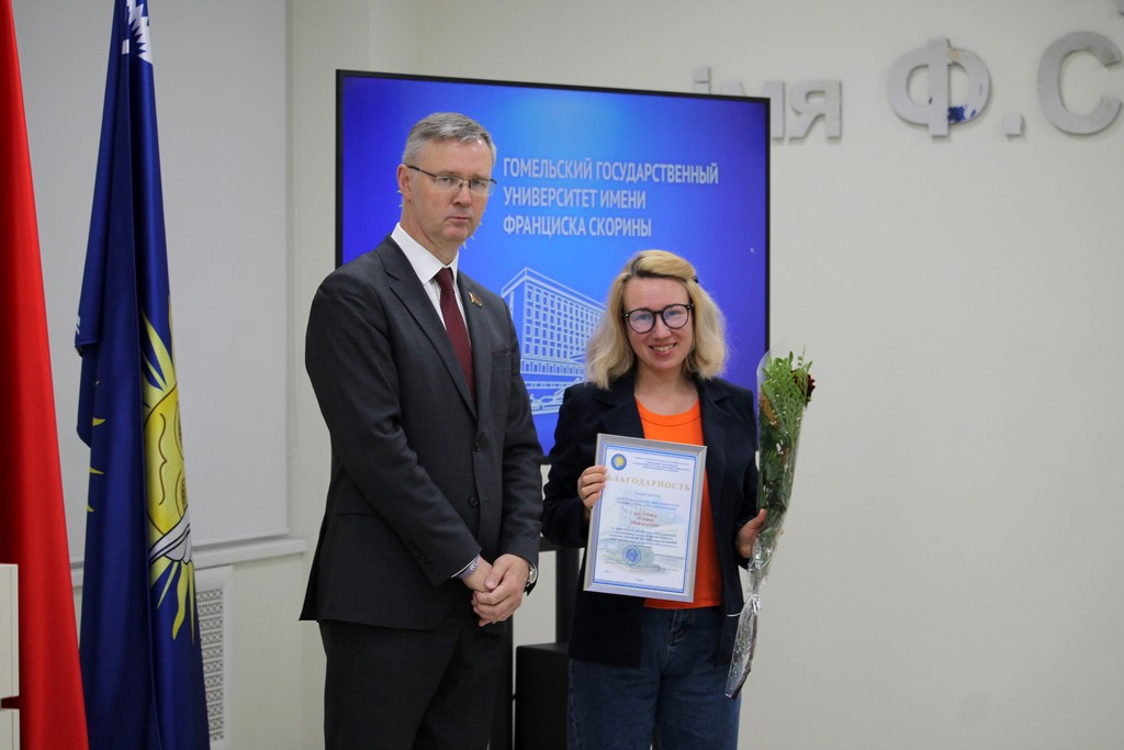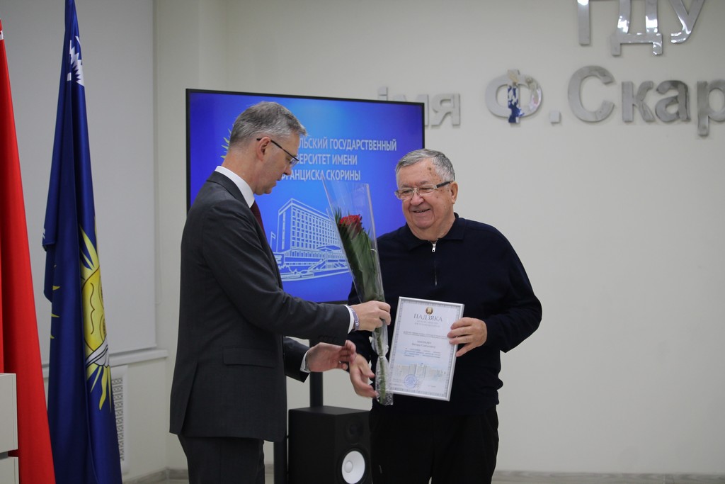 Благодарности Премьер-министра Республики Беларусь «за шматгадовую пленную навукова-педагагiчную дзейнасць, дасягнутыя поспехi ў падрыхтоўцы высокаквалiфiкаваных спецыялiстаў» удостоен профессор кафедры алгебры и геометрии Виктор Монахов. В связи с присвоением ученого звания доцента по специальности «Электроника и наноэлектроника» аттестат доцента вручен доценту кафедры общей физики Сергею Соколову. Почетной грамотой университета за многолетнюю плодотворную учебную и воспитательную работу по подготовке квалифицированных специалистов награждены старший преподаватель кафедры биологии Татьяна Азявчикова, кандидат химических наук, доцент кафедры химии Елена Воробьева, кандидат физико-математических наук, доцент, заведующий кафедрой оптики Владимир Гайшун, кандидат экономических наук, доцент кафедры экономической информатики, учета и коммерции Сергей Говейко, кандидат филологических наук, доцент кафедры белорусского языка Екатерина Хазанова.