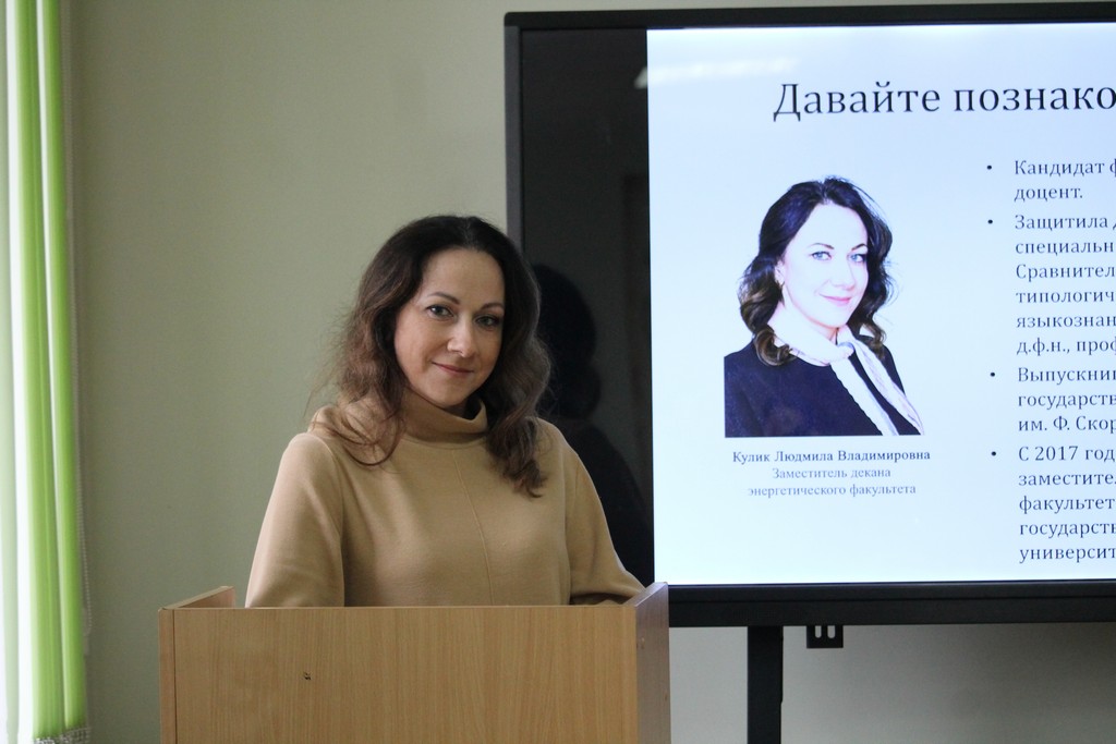 Следующим спикером была Людмила Кулик – выпускница филологического факультета, кандидат филологических наук, доцент, заместитель декана энергетического факультета Гомельского государственного технического университета им. П.О. Сухого.