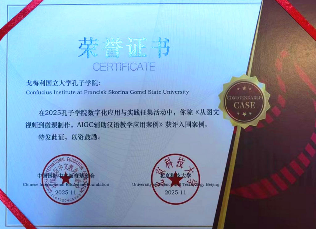 Методическая разработка Института «От текстов и видео до микроуроков: применение AIGC в обучении китайскому языку» (автор преподаватель китайского языка Жан Шувень) была высоко оценена и вошла в шорт-лист мероприятия по цифровым приложениям и практикам Институтов Конфуция. В подтверждение этого достижения гомельский вуз получил соответствующий сертификат.