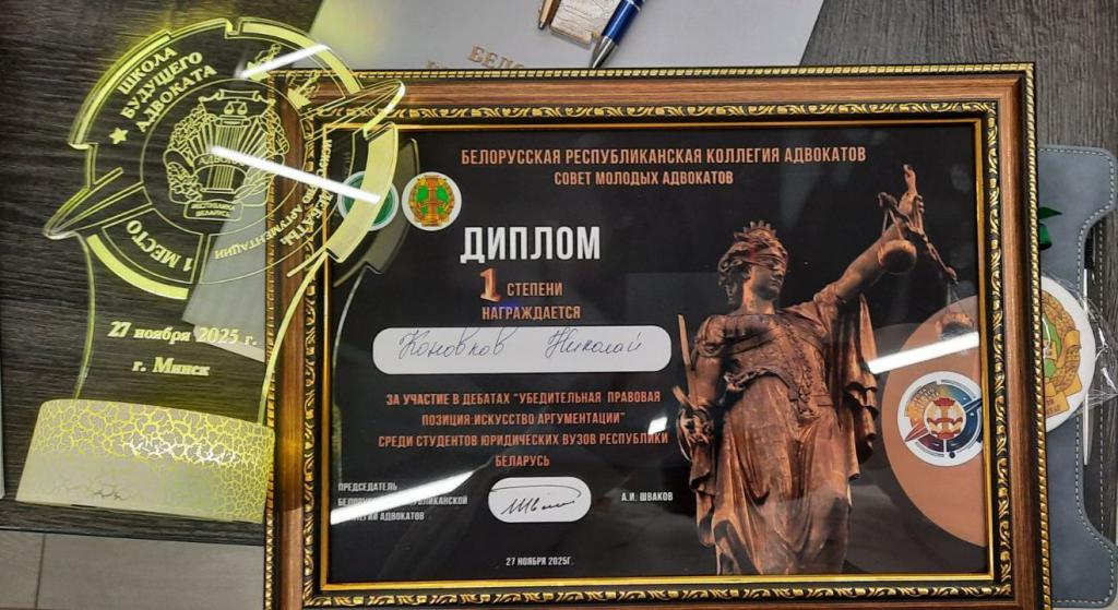 Поздравляем студента 2 курса юридического факультета Николая Коновкова, удостоенного Диплома I степени за участие в дебатах «Убелительная правовая позиция: искусство аргументации», организованных Белорусской республиканской коллегией адвокатов среди студентов юридических вузов Республики Беларусь.