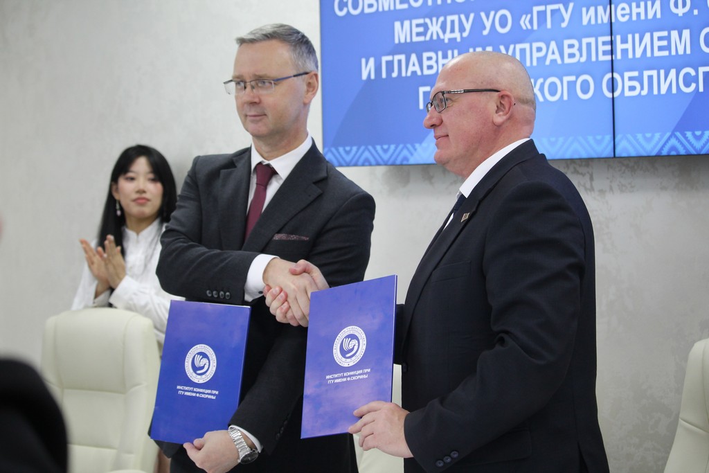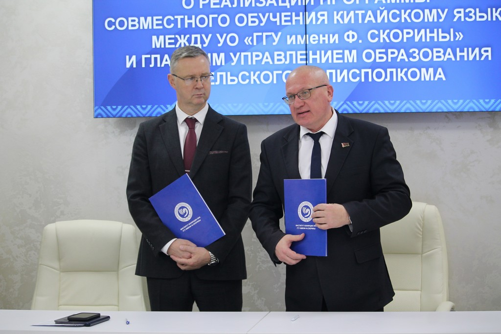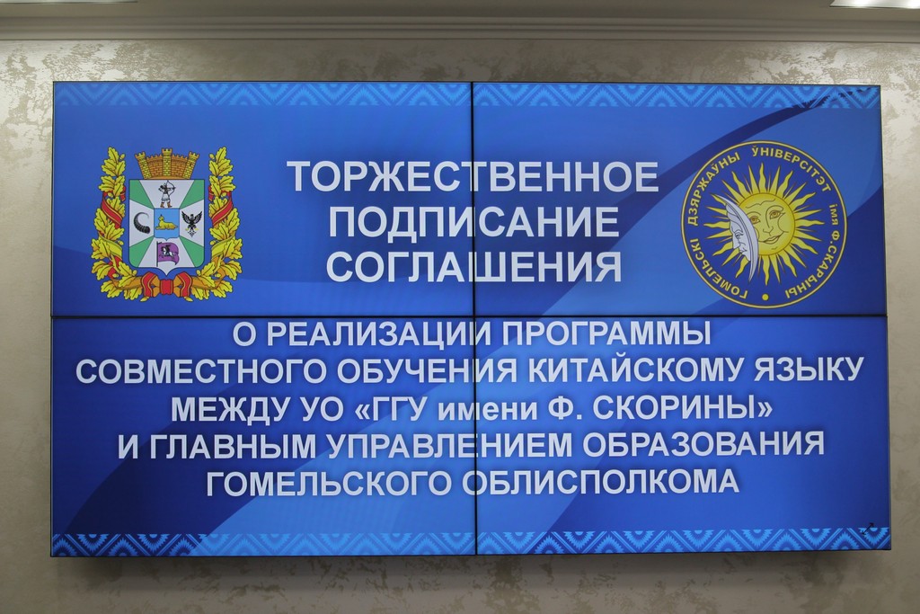 Сегодня между ГГУ имени Ф. Скорины и главным управлением образования Гомельского облисполкома было подписано соглашение о реализации программы совместного обучения китайскому языку.