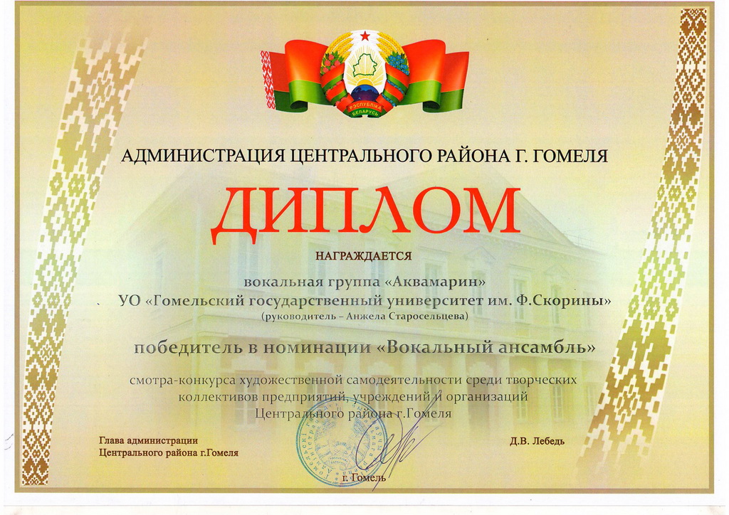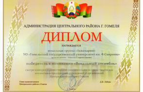 • диплом победителя в номинации «Вокальный ансамбль» (вокальная группа «Аквамарин»);
