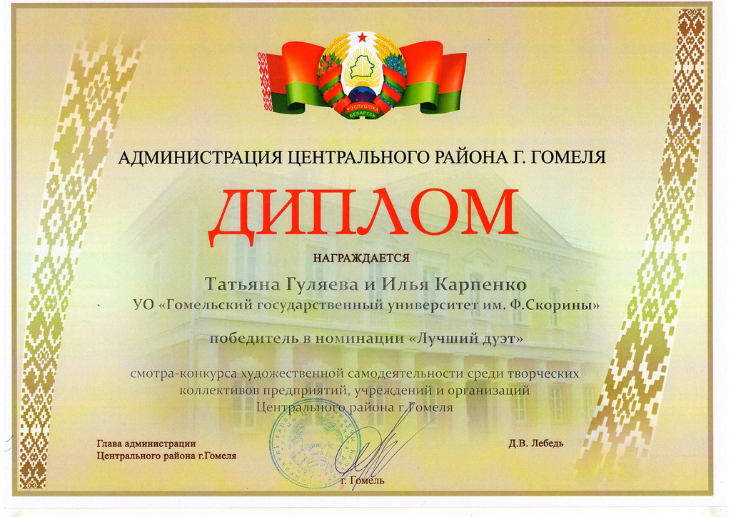 • диплом победителя в номинации «Лучший дуэт» (Татьяна Гуляева и Илья Карпенко);