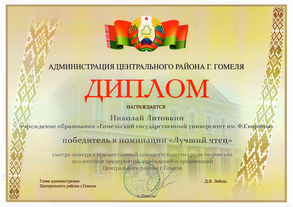 • диплом победителя в номинации «Лучший чтец» (Николай Литовкин);