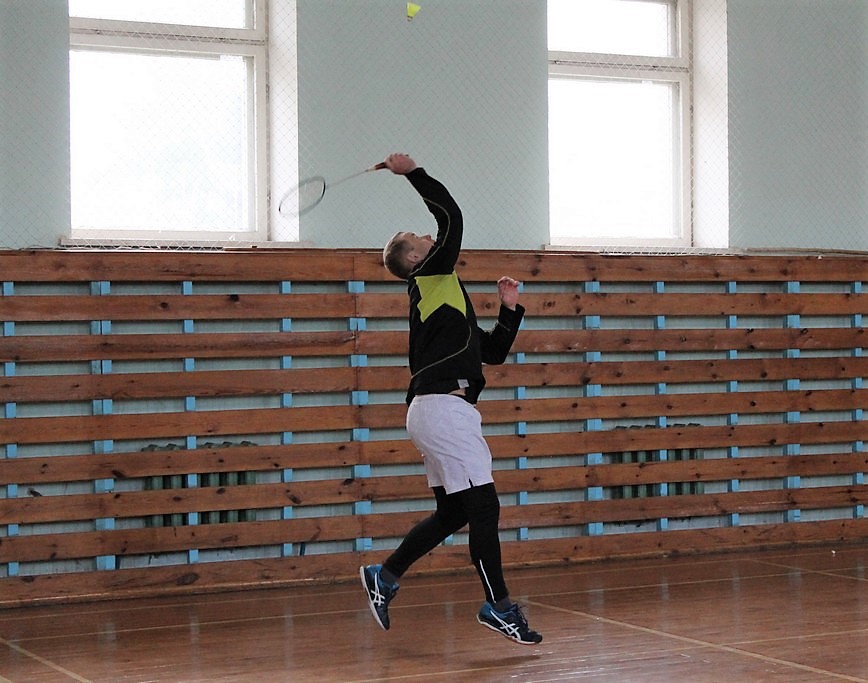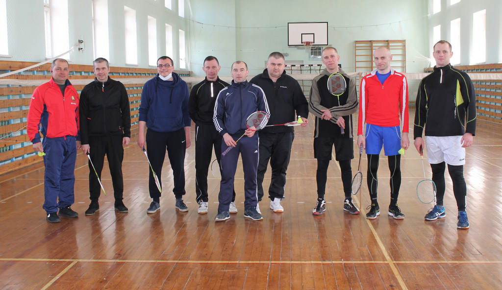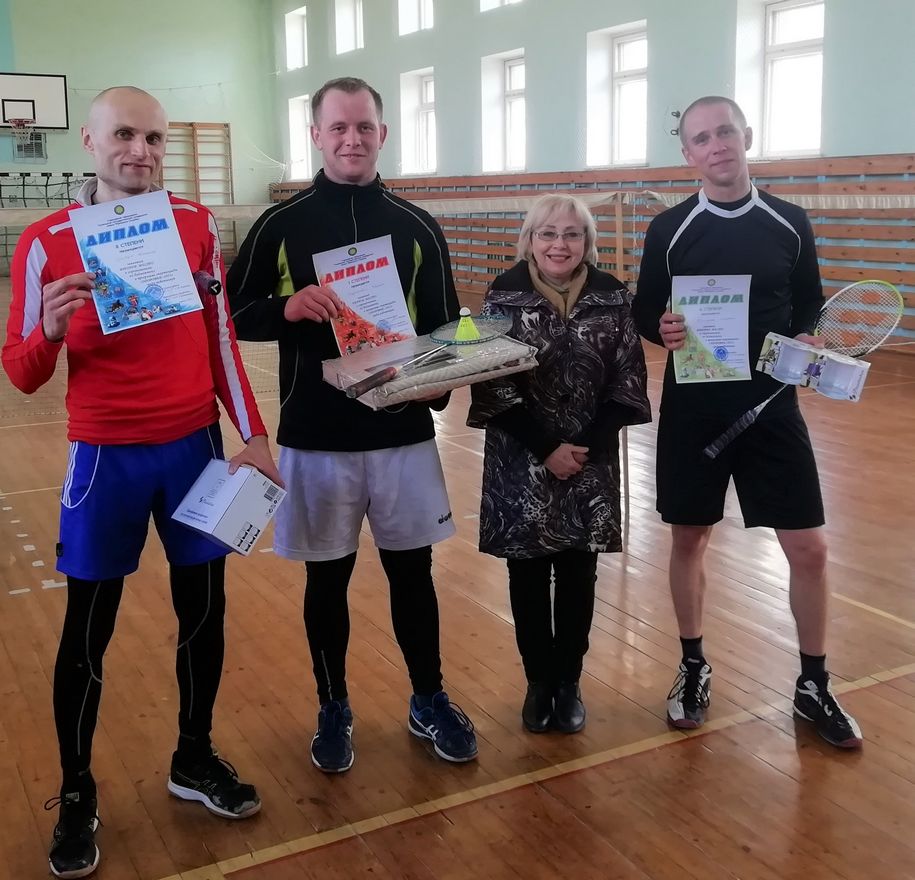 羽毛球(男子)。第一名-Fedorovich E.A.,第二名-Tsarun V.V.,第三名-Khikhlukha D.A.,体育和体育部的所有代表。