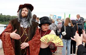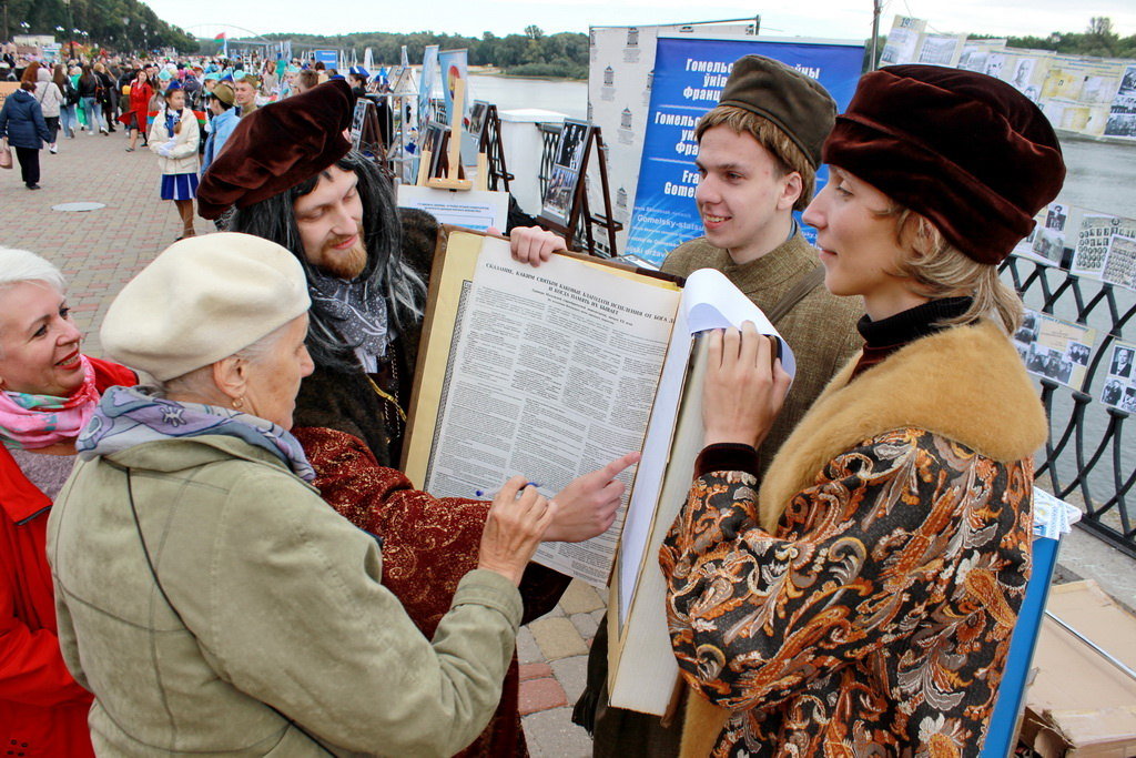 戈梅利的居民和城市的客人非常高兴地与“现场”弗朗西斯斯科里纳、真人大小的木偶和嵌套娃娃合影留念,参加了关于家乡历史知识的测验,参加了大师班并将他们的愿望留在了第一台印刷商的书中。