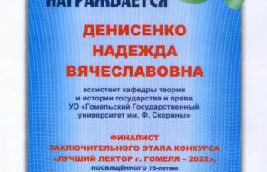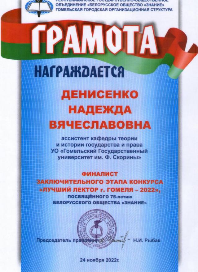 由于多年来在科学、教育和教育活动领域的卓有成效的工作以及与组织成立 75 周年相关的活动,白俄罗斯历史系主任 Oksana Yashchenko 被授予知识社会荣誉证书。 大学法学院国家与法律理论与历史系助理娜杰日达·杰尼先科 (Nadezhda Denisenko) 获得了“戈梅利最佳讲师 - 2022”竞赛决赛入围者的文凭。