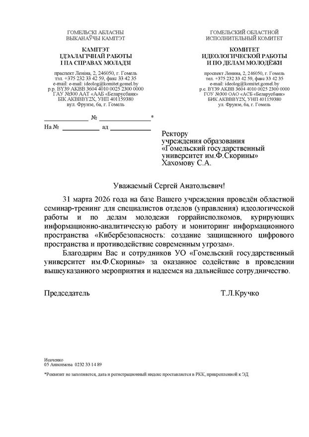 • Благодарность за проведение областного семинара-тренинга по кибербезопасности