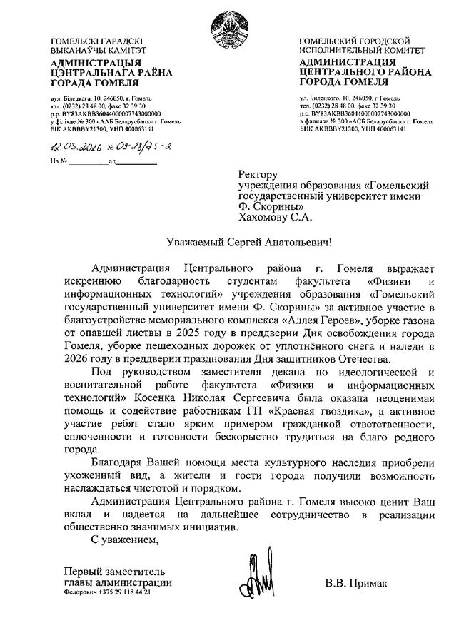 • Благодарность за активное участие в благоустройстве мемориального комплекса "Аллея Героев" (Благодарность Косенку Н.С.)