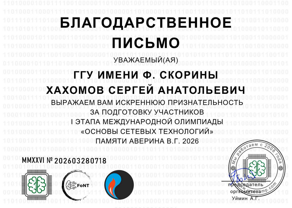 • Благодарственное письмо за подготовку участников международной олимпиады