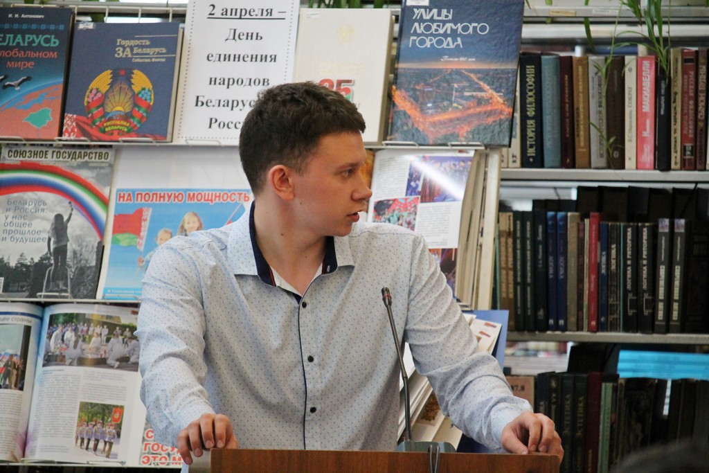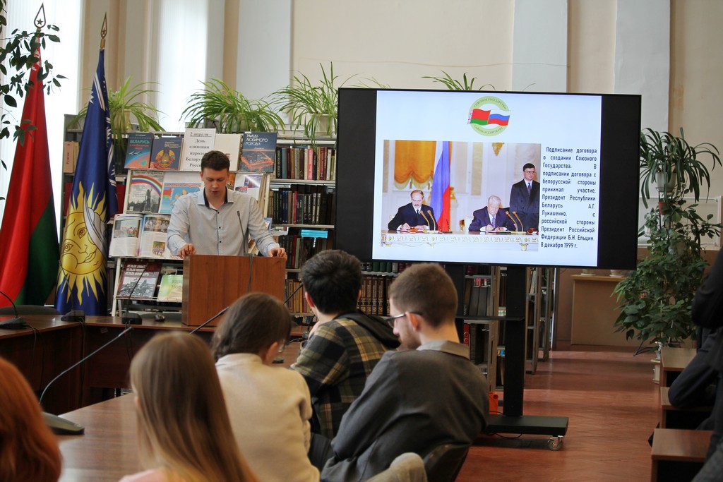 Студенты-историки Илья Зинович и Егор Ковалев подготовили сообщения о ключевых вехах истории становления Союзного государства, а также о современных интеграционных процессах и плодотворном, тесном сотрудничестве во всех сферах жизнедеятельности государств: в экономике, культуре, крупных промышленных проектах, транспорте, ядерной энергетике, освоении космического пространства, науке, сельском хозяйстве, проектах импортозамещения.