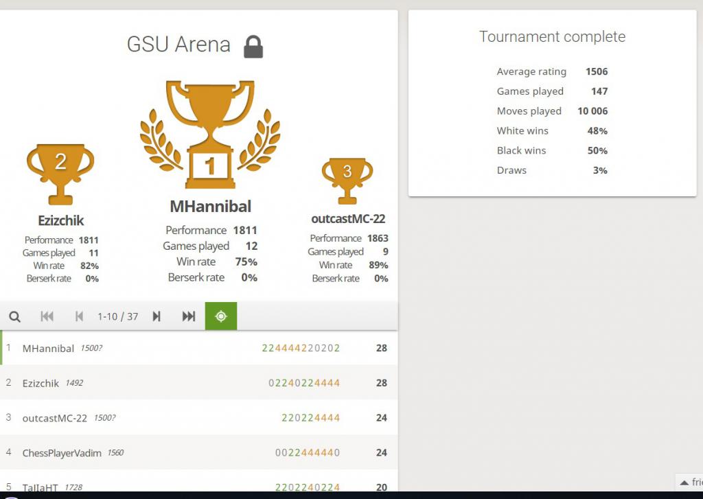 Участие в интеллектуальном соревновании приняли 37 студентов нашего вуза. Турнир проводился на платформе Lichess.org. Количество туров было ограничено временем проведения соревнований. Каждому участнику давалось 10 минут на партию. 2 часа без остановки участники использовали свои внутренние ресурсы, чтобы продемонстрировать мастерство игры.