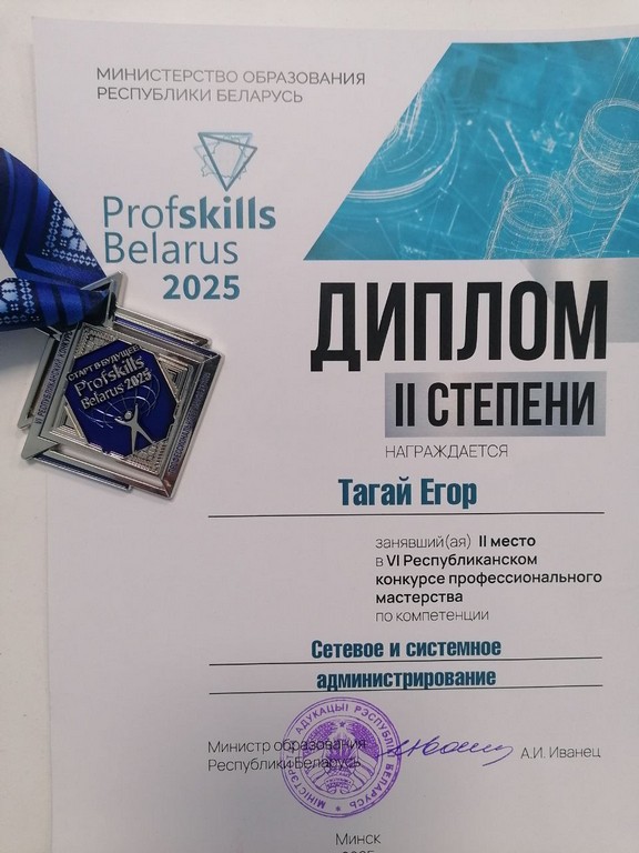 Вдохновляющий успех студента факультета физики и информационных технологий Егора Тагая стал ярким событием на VI Республиканском конкурсе профессионального мастерства Profskills Belarus-2025. Егор завоевал серебряную медаль в компетенции «Сетевое и системное администрирование», продемонстрировав высокий уровень работы с сетевым оборудованием и управлением сетевыми сервисами.