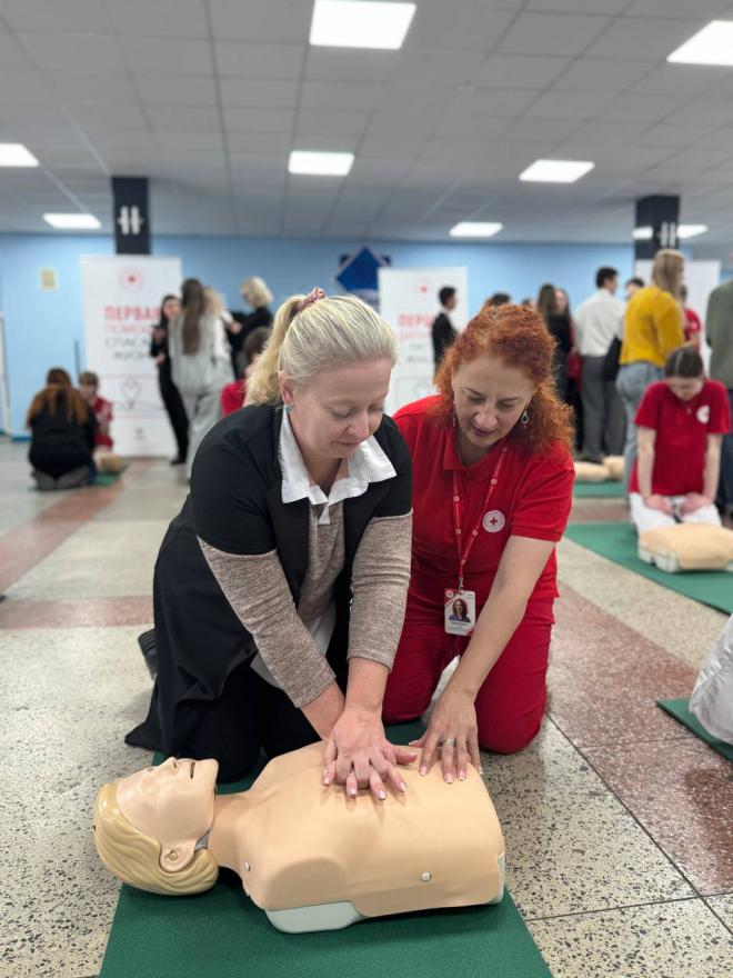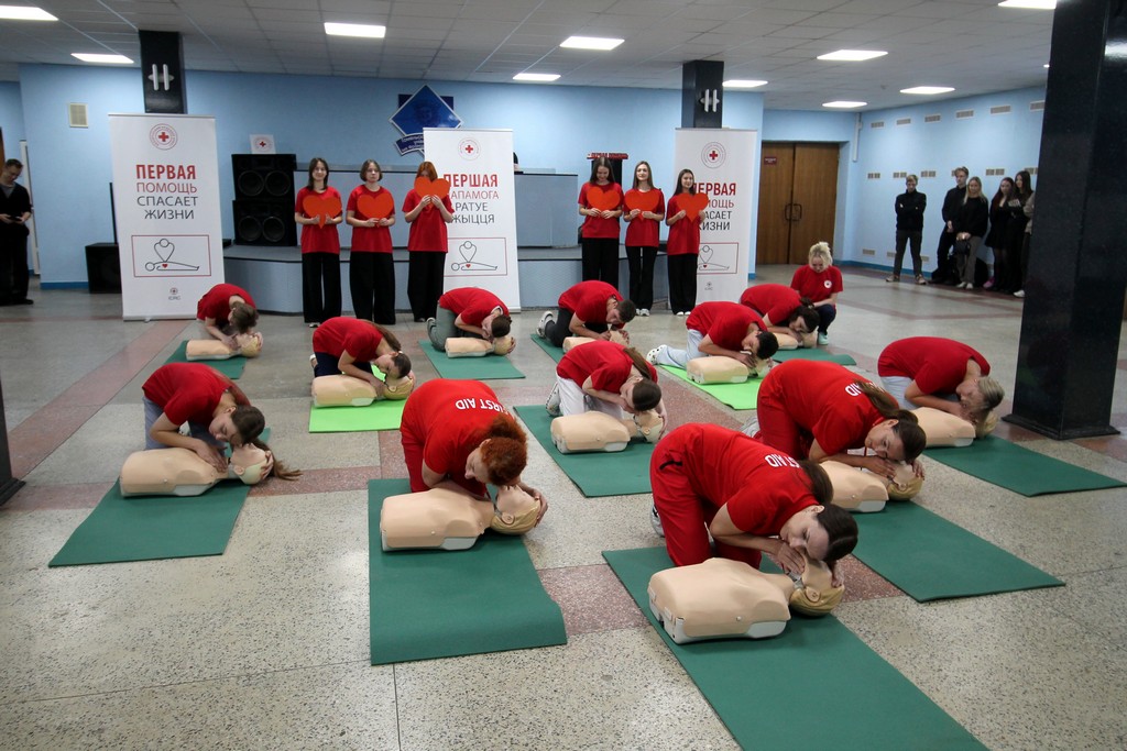 Обучающий флешмоб для сотрудников и студентов провели инструкторы и волонтеры Белорусского Красного Креста. Участники узнали о важности своевременного оказания первой помощи при остановке сердца и смогли практически отработать приемы сердечно-легочной реанимации на специальных манекенах.