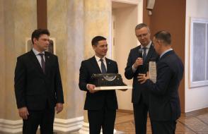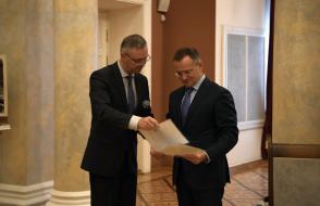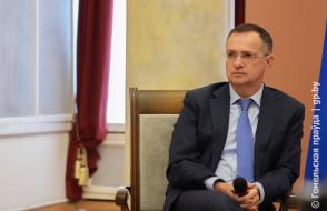 Ректор университета Сергей Хахомов вручил Владимиру Мединскому символичный торт в виде печатающей машинки. Этот необычный подарок отражает тесную связь легендарного полководца, Маршала Советского Союза Константина Константиновича Рокоссовского, с вузом в годы Великой Отечественной войны. Вместе с тортом Сергей Анатольевич передал копии уникальных документов – писем, которые коллектив Гомельского педагогического института в 1944 году направил командующему войсками Белорусского фронта К. К. Рокоссовскому. Владимир Ростиславович с искренней благодарностью принял подарки и заверил, что они займут достойное место в экспозиции Музея военной истории Российского военно-исторического общества.