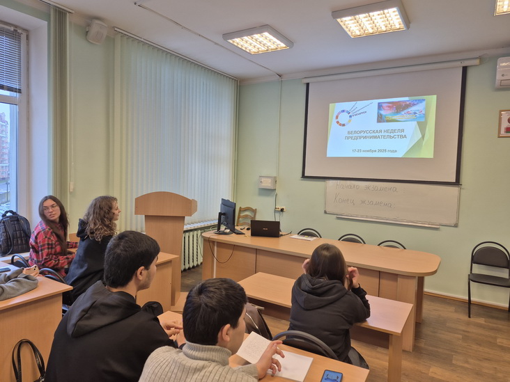 Обзор Белорусской недели предпринимательства подготовила старший преподаватель кафедры экономики и управления Мария Ятченко. Она рассказала о ключевых темах, целях и участниках Белорусской недели предпринимательства 2025 года, ознакомила студентов с планом проведения Белорусской недели предпринимательства, включающим более 130 мероприятий, которые прошли по всей стране, а также с циклом мероприятий в рамках Белорусской недели предпринимательства, которые прошли на экономическом факультете 17 – 21 ноября.