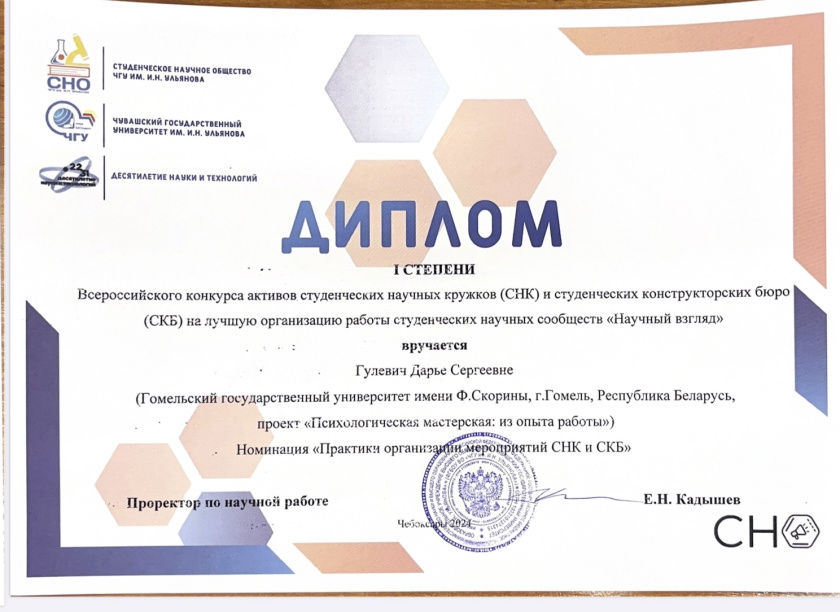 Яркую победу в научно-образовательной сфере одержала студентка факультета психологии и педагогики Дарья Гулевич. Она заняла первое место во Всероссийском конкурсе «Научный взгляд», представив лучшую модель организации работы студенческих научных сообществ.